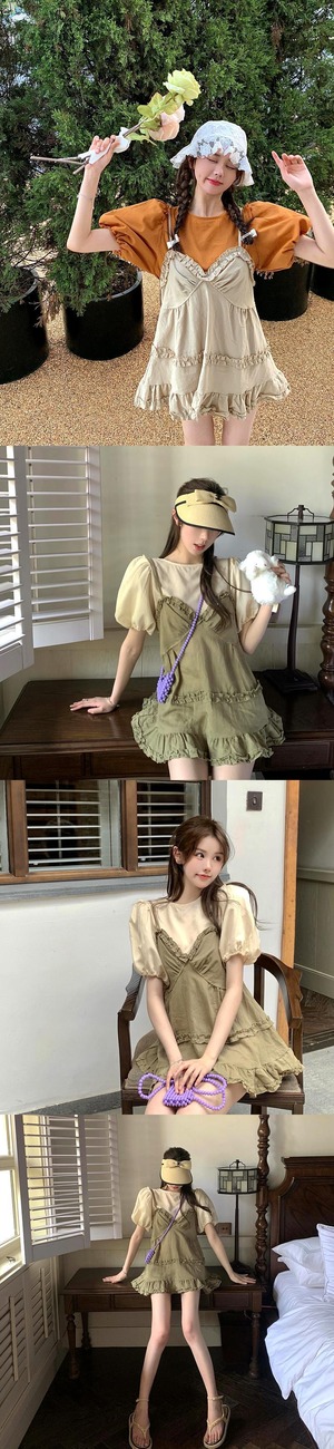 色:ベージュサスペンダースカート,緑のドレス,ベージュトップ,オレンジトップ