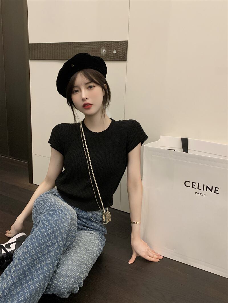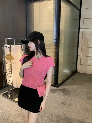 ショートニットセーター Tシャツ ラウンドネックプルオーバー 半袖スリーブスリムトップス サマー ハーフスリーブ 夏物 Oネック Xiaofeijia66351276234