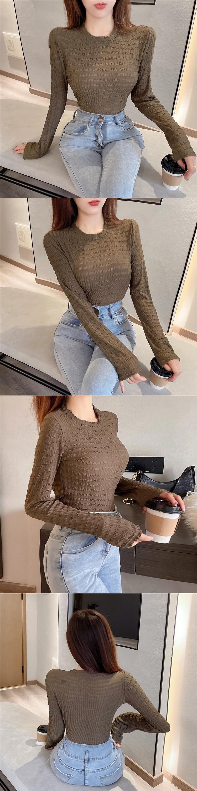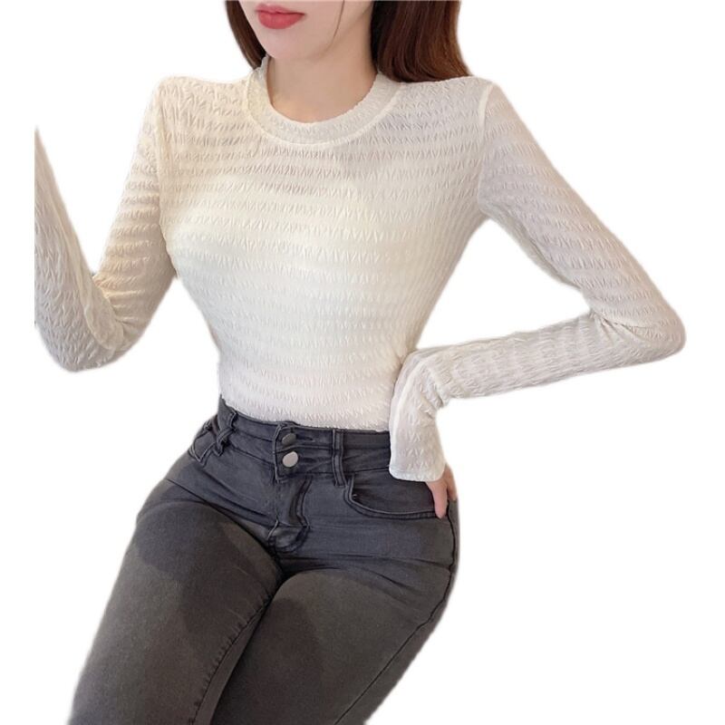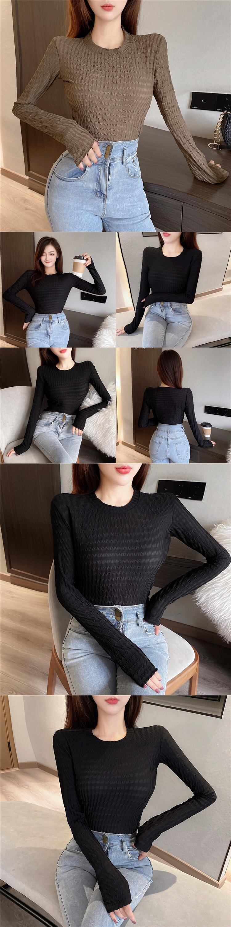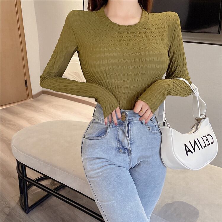 オータムソリッド カラープリーツニットストレッチラウンドネック ロング エラスティック 伸縮 秋物 ウィンター 冬物 Oネック Tシャツ ソリッドカラー Xiaofeijia17933639988
