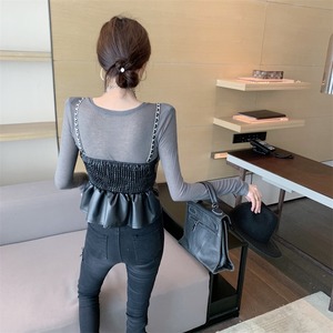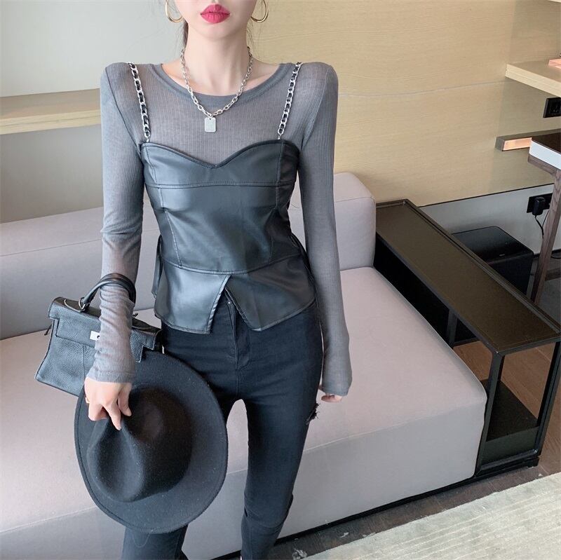 チェーン オータムスタイルショートレザーバックストレッチトップス エラスティック 伸縮 大人ガーリー スウィート キュート カジュアル 秋物 Xiaofeijia33315674628