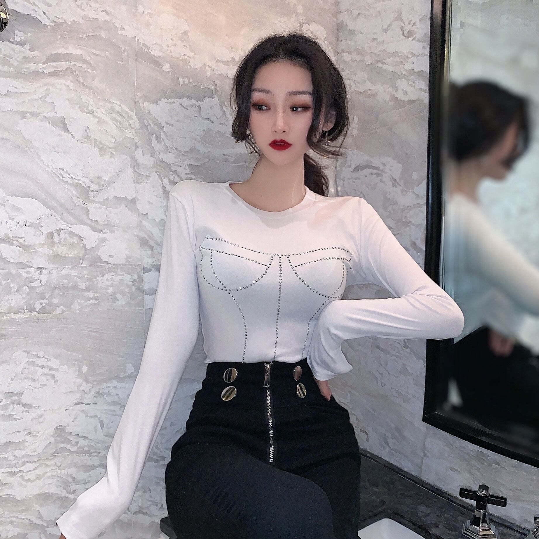 ラインストーンTシャツ シャツ オータムラウンドネックショートトップス ロング 秋物 Oネック Xiaofeijia31372710376