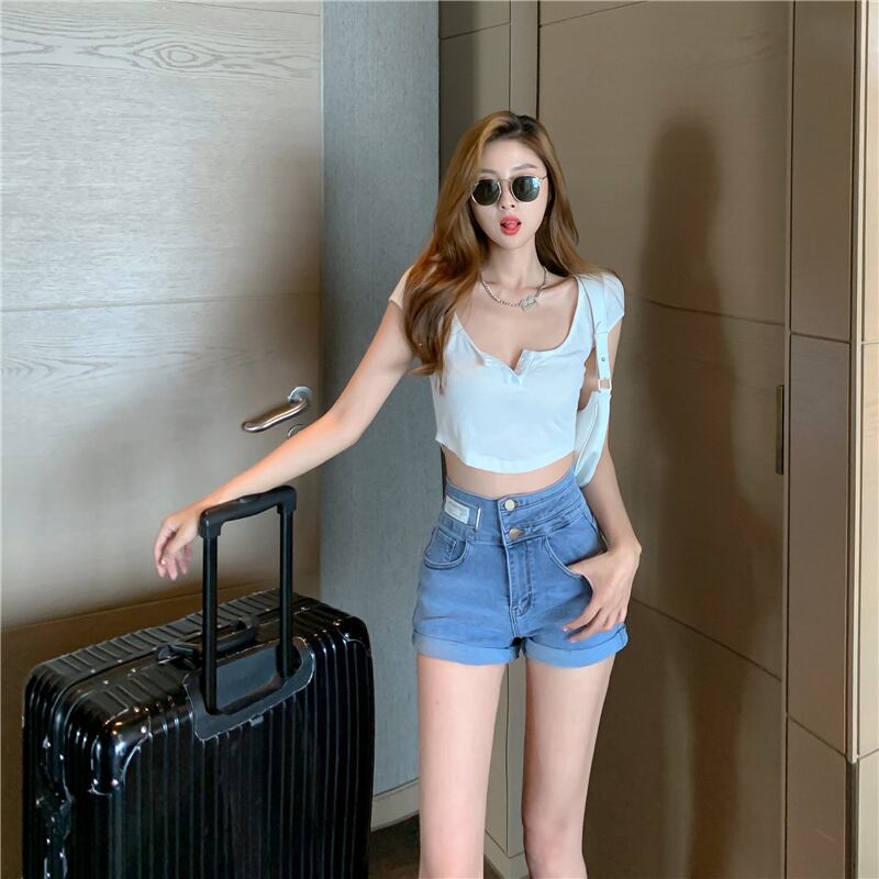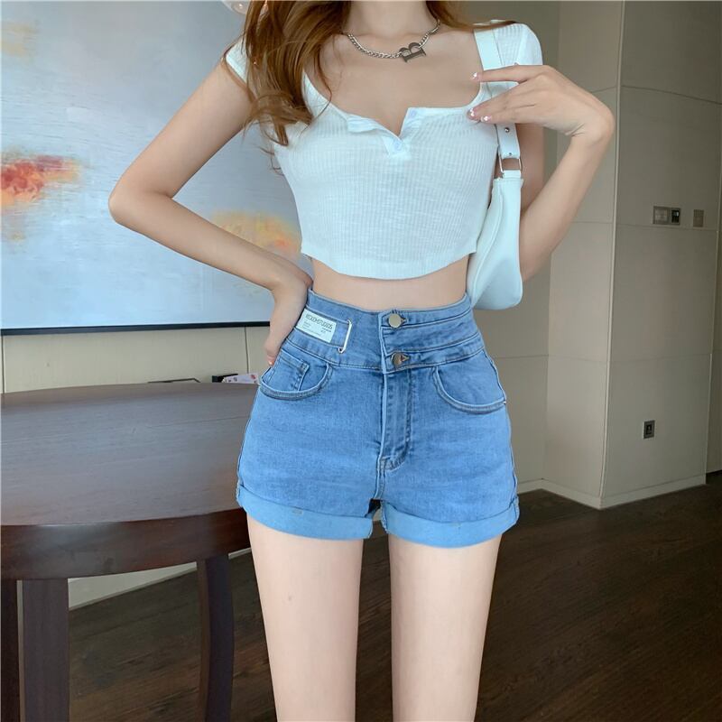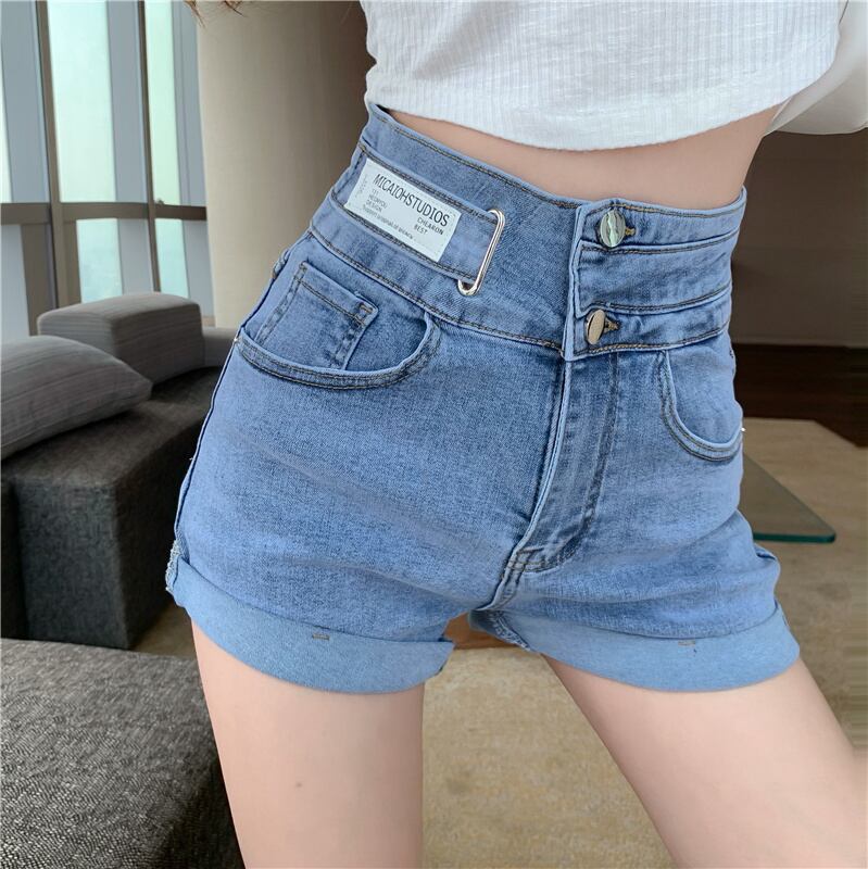 サマーダブルバックルハイウェストウェストスリムショートジーンズ 夏物 Xiaofeijia11486525153