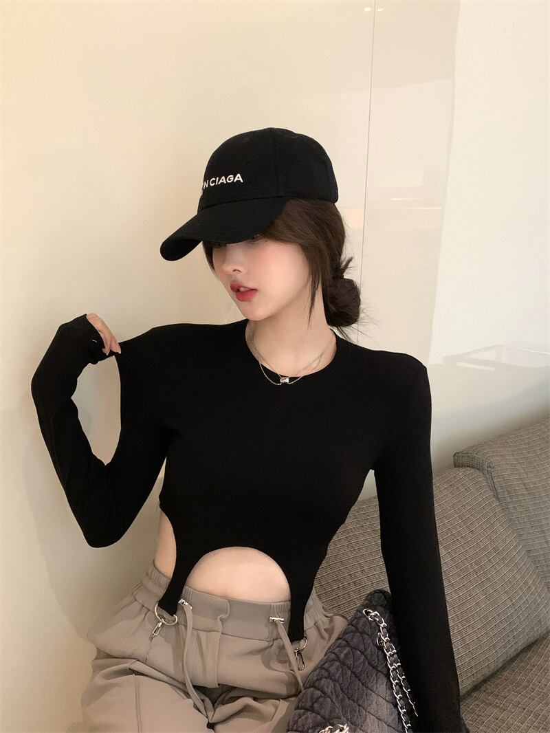 メタルニットTシャツ オータムショートクロップドラウンドネックトップス ロング 秋物 Oネック Xiaofeijia824049697