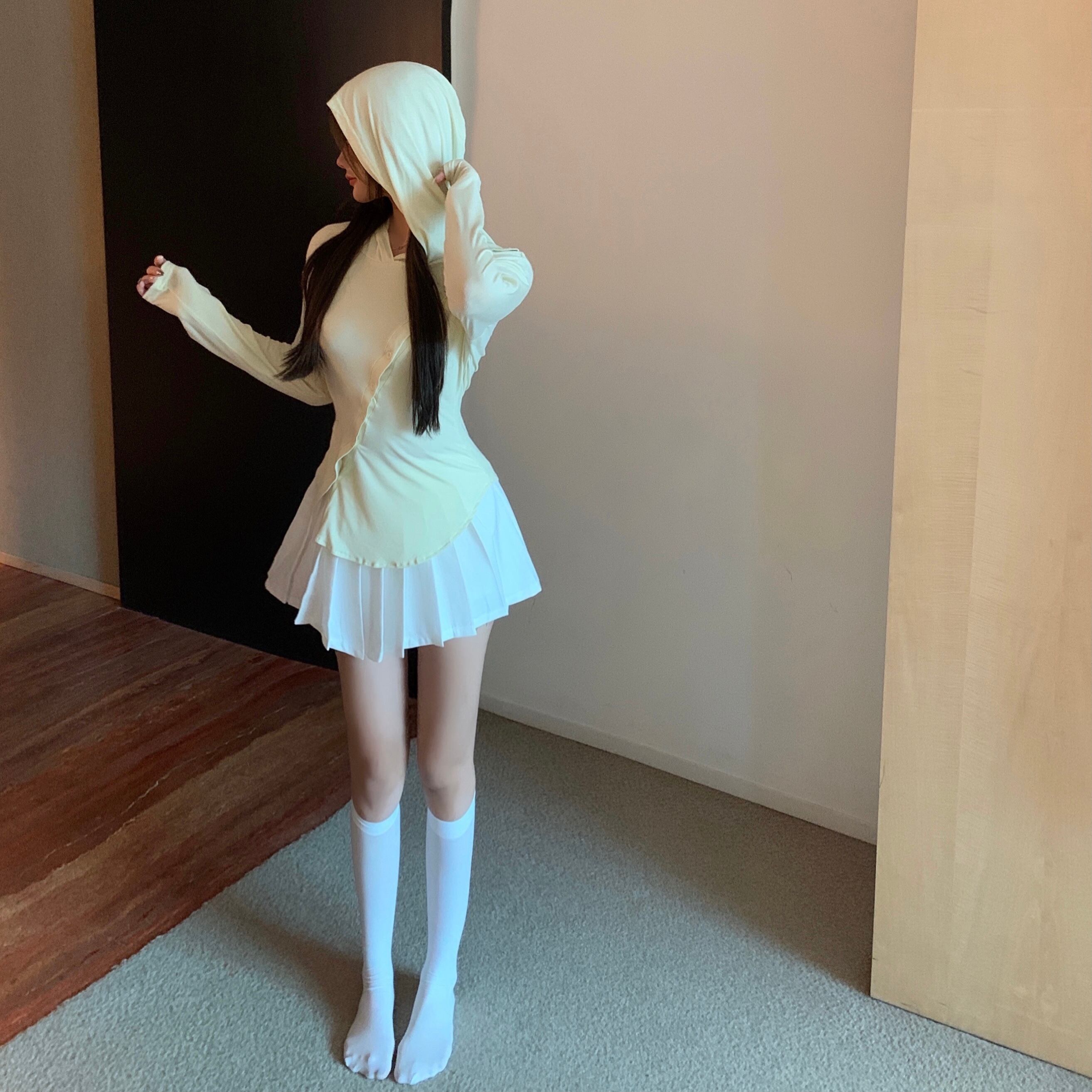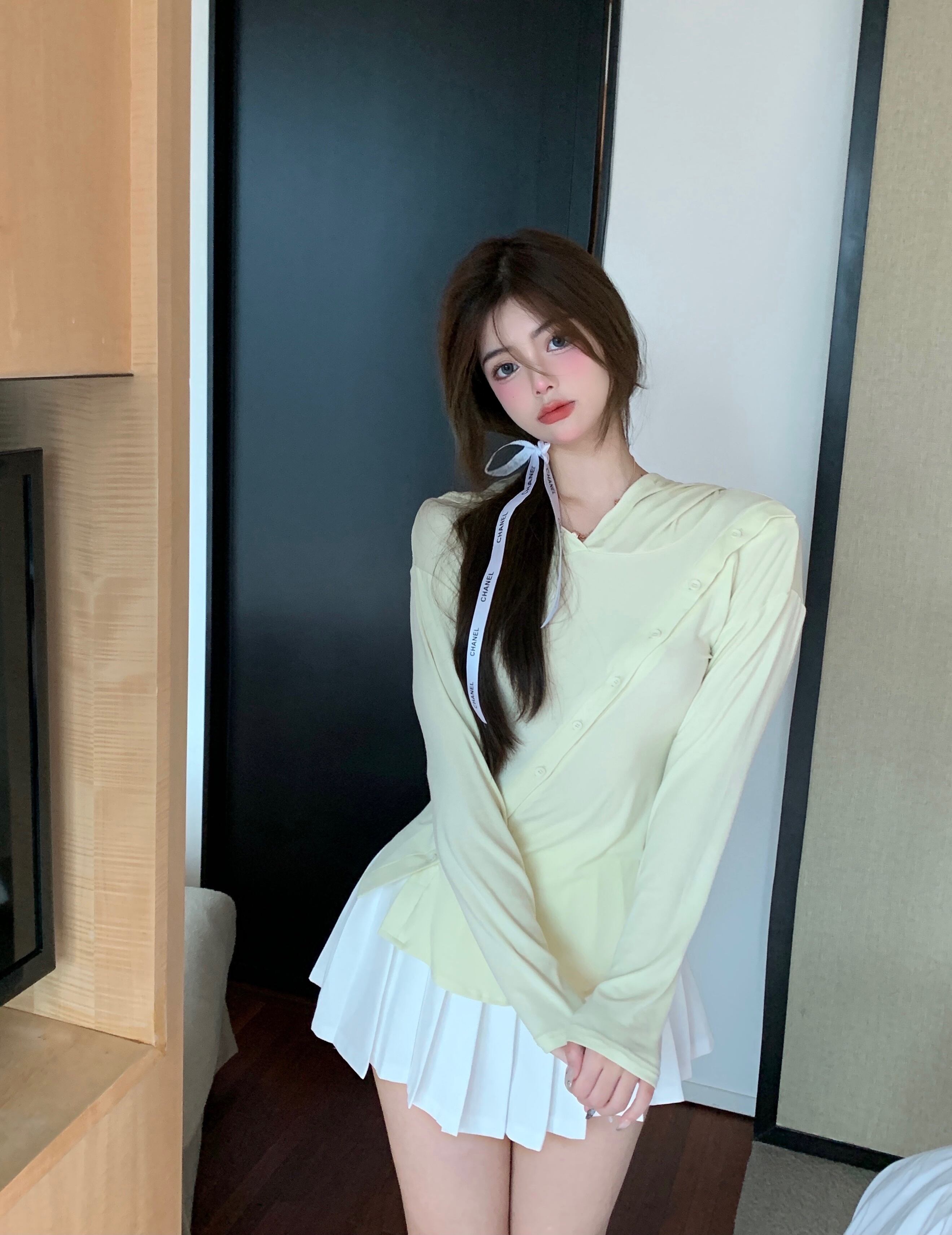 色:ベージュグリーントップ,キャメルグレートップ,白いプリーツスカート,グレープリーツスカート