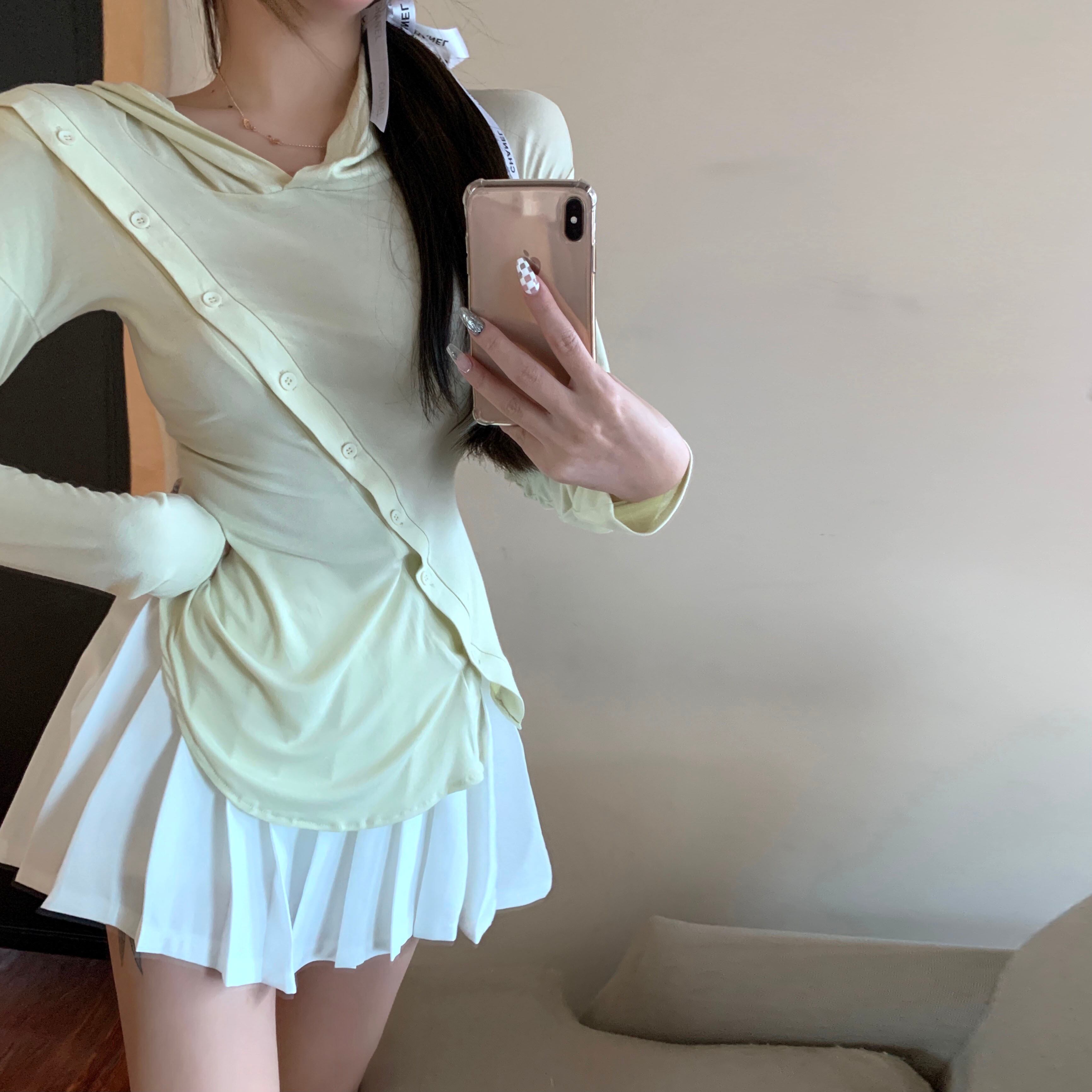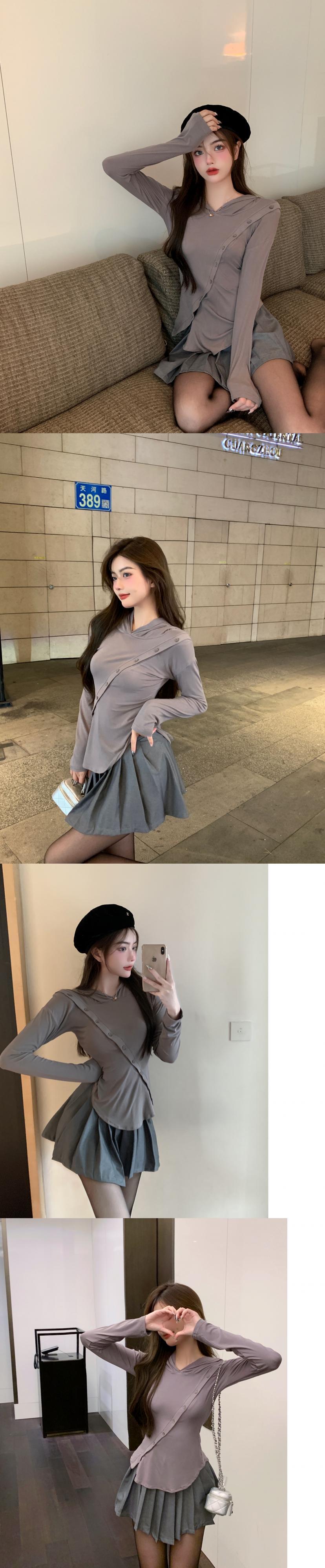 スプリングオータムブラウス フードTシャツ シャツ ソリッド カラートップス ロング 春物 秋物 ソリッドカラー Xiaofeijia7160178676