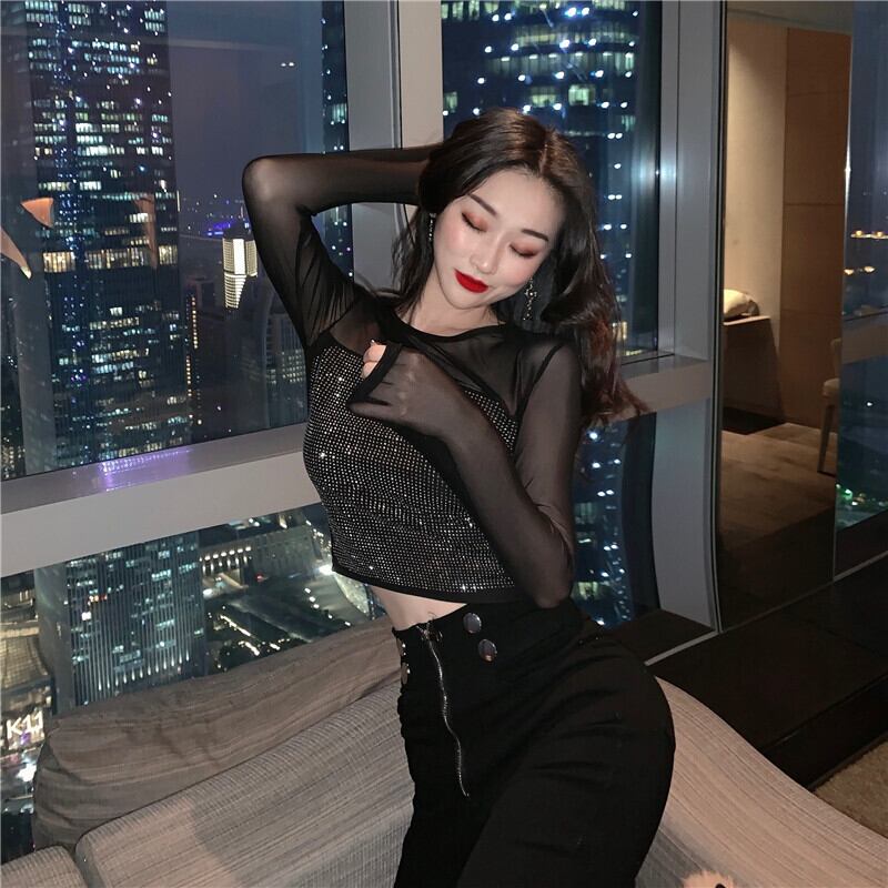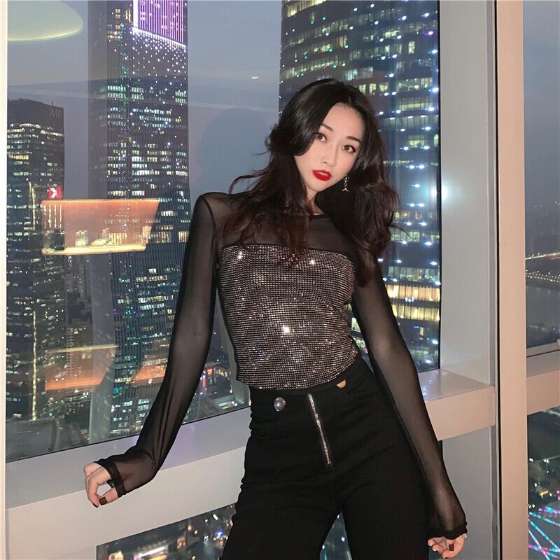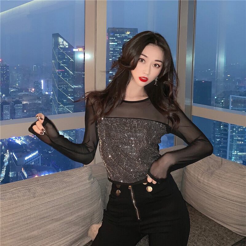 ラインストーン長袖スリーブTシャツ ロング Xiaofeijia32631039378