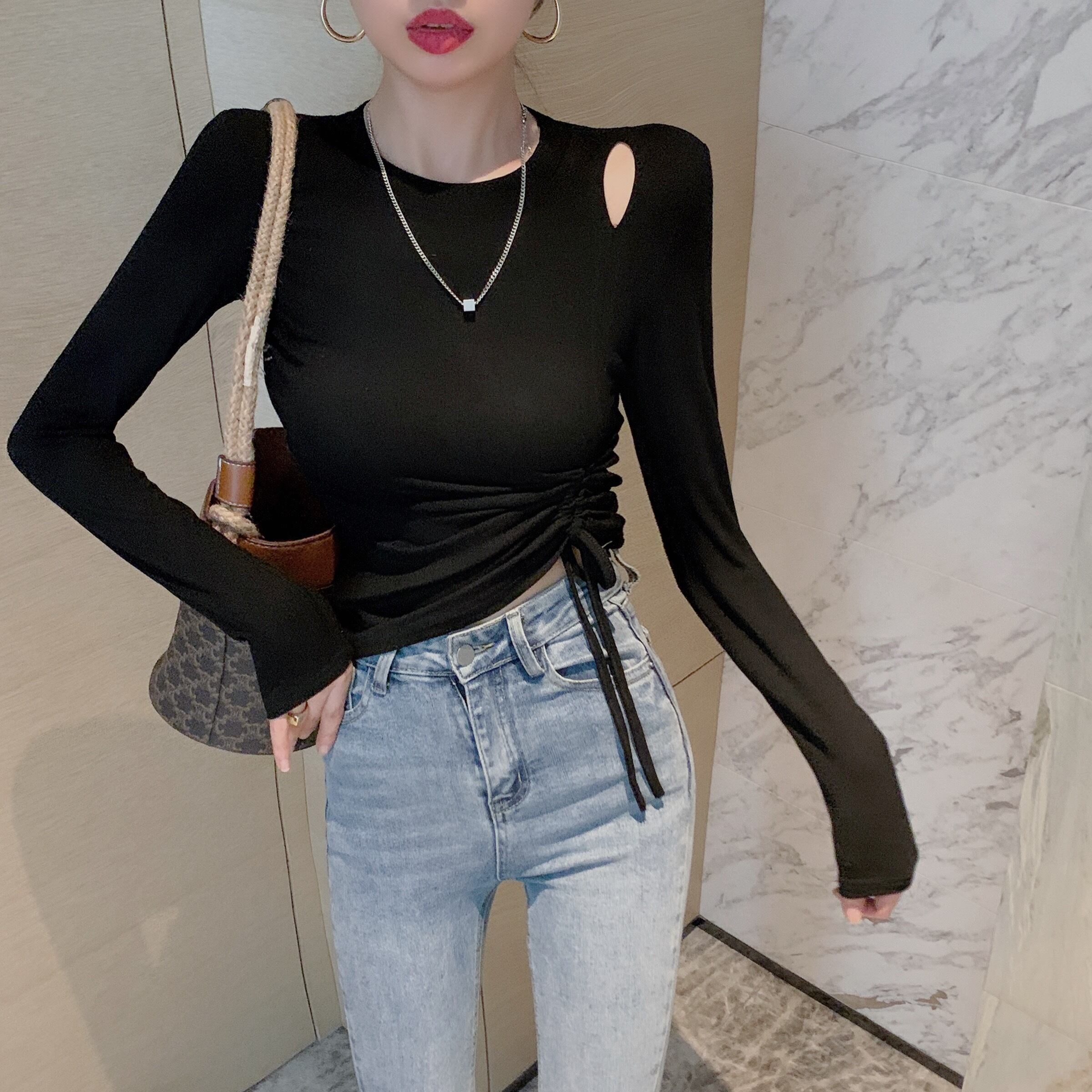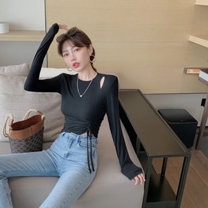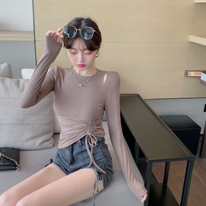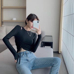 Tシャツ オータムギャザーラウンドネックブラウス レディース ロング 秋物 Oネック オフショルダー Xiaofeijia78667012541