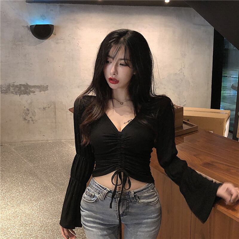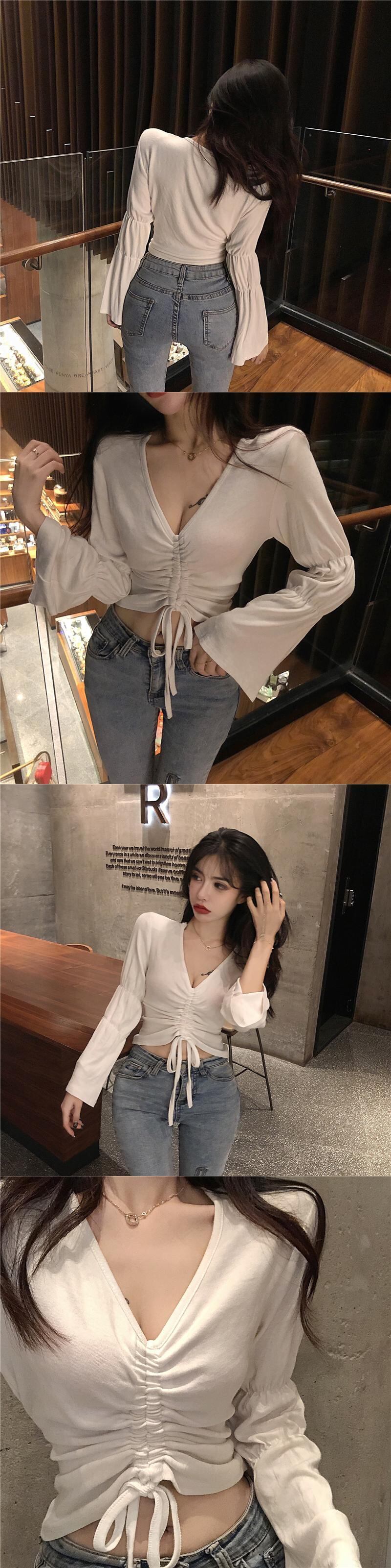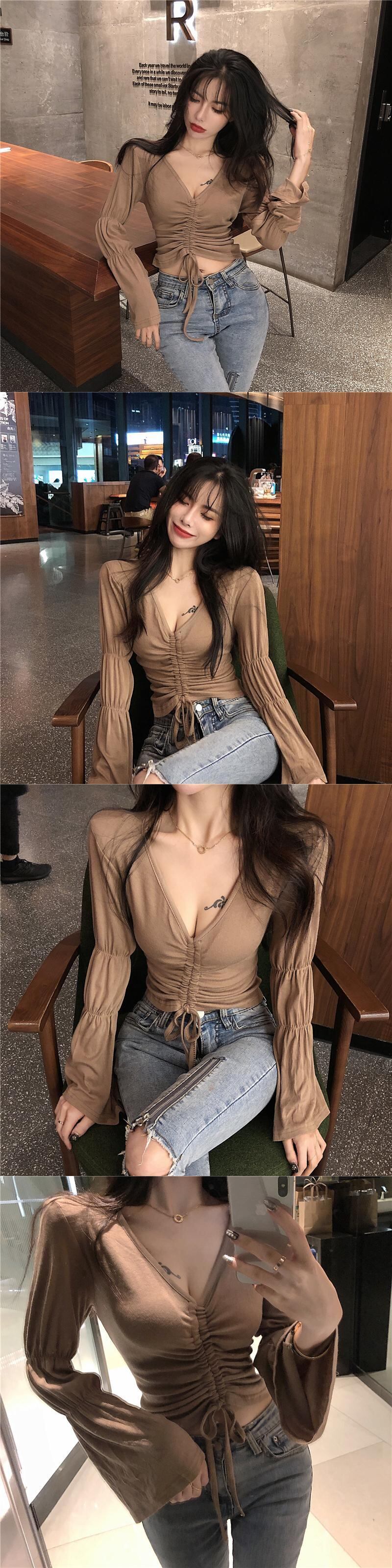 オータムギャザーVネックTシャツ スリム薄手ショートトップス ロング 秋物 Xiaofeijia25262046456
