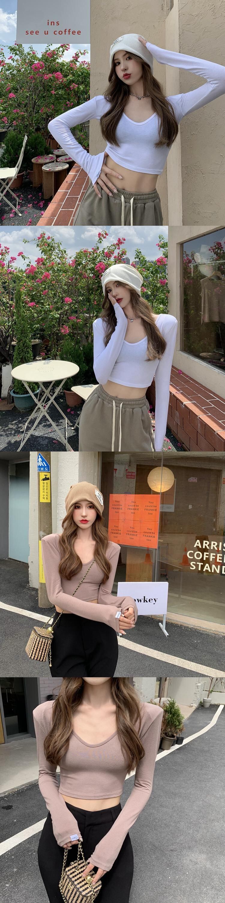 スタイルTシャツ ストレッチVネックショートトップス オータム ロング エラスティック 伸縮 秋物 Xiaofeijia65743506783