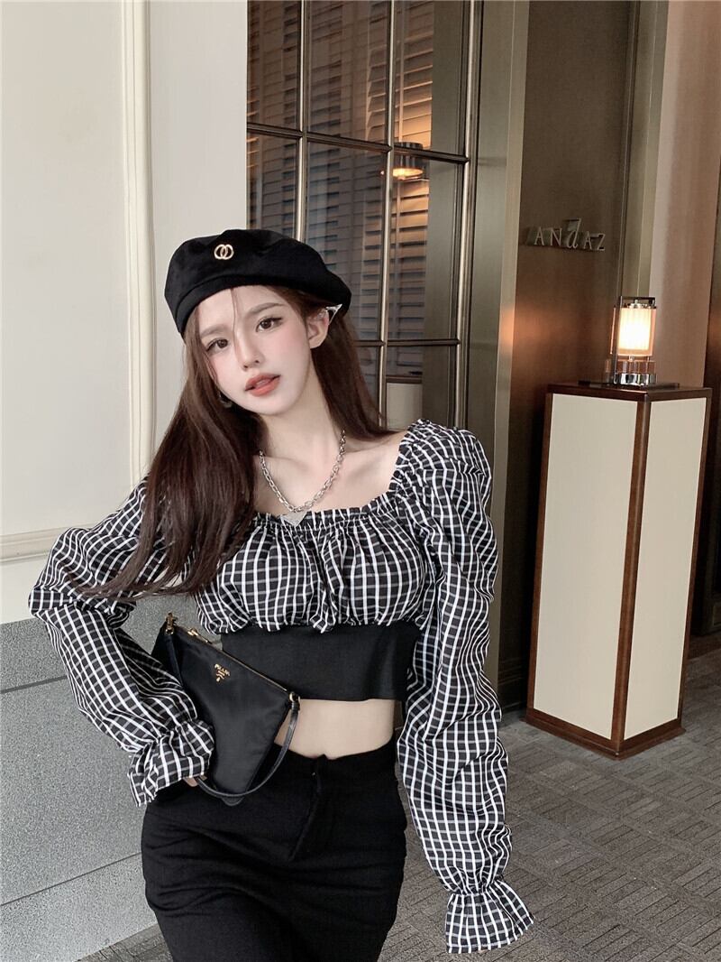 カラートップス ウェスト格子柄シャツ レディース ロング スクウェア Xiaofeijia46577681467