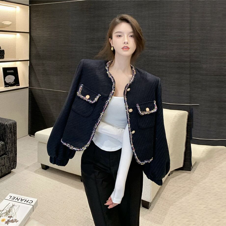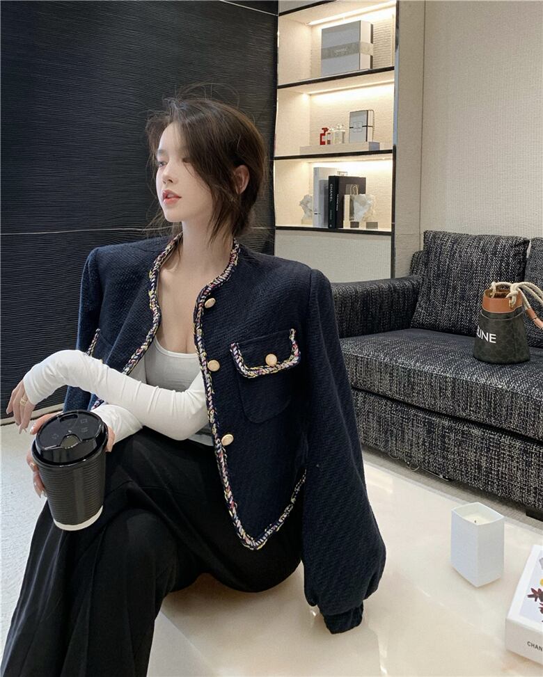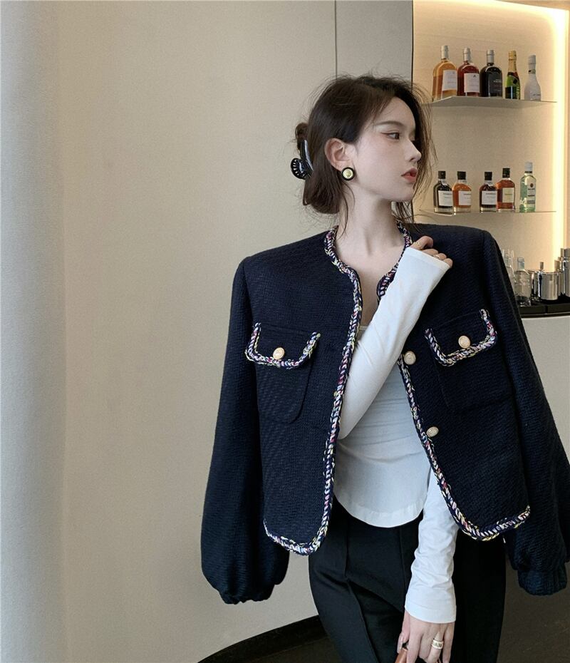 カラーネイビーブルージャケット オータムウィンターショートラウンドネックトップス レディース ロング 大きめサイズ 秋物 冬物 Oネック Xiaofeijia34037547952