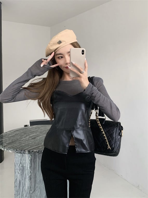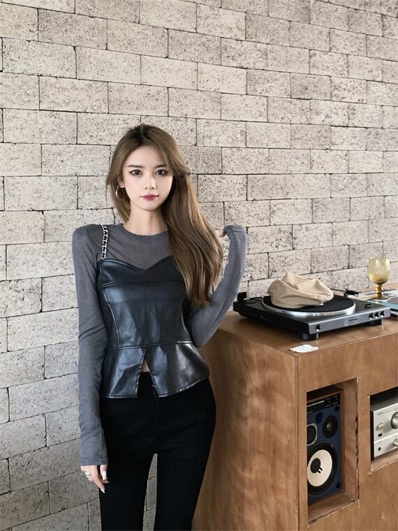 オータムスタイルスリムシャツ チェーン レザーショート ロング 秋物 Xiaofeijia74032659926