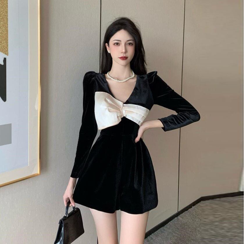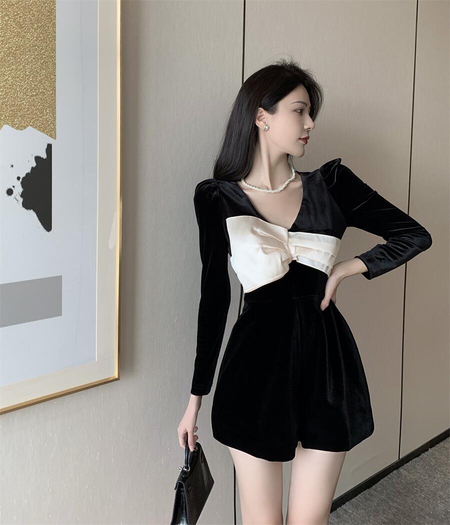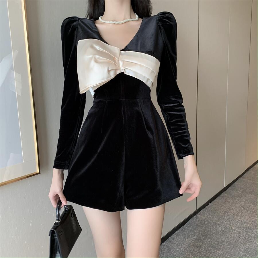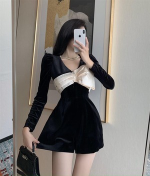 スリーブカラーリボンベルベットウェストジャンプスーツ オールインワン Xiaofeijia33898267738