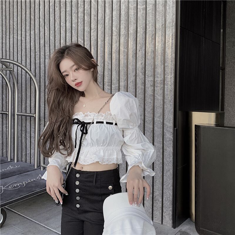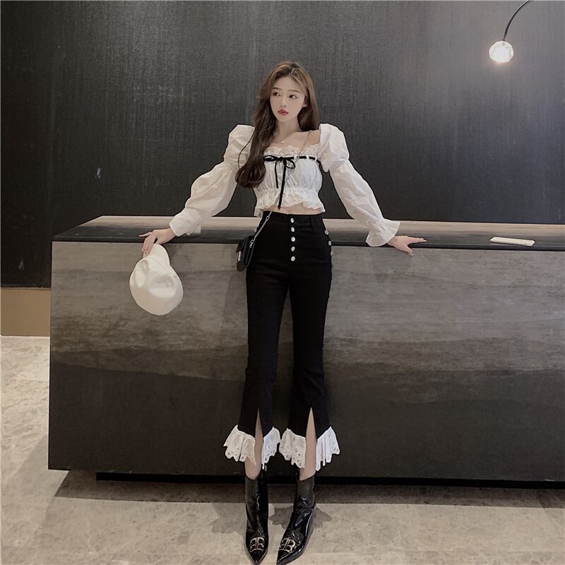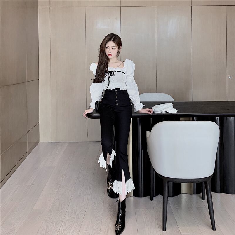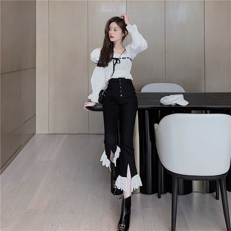 カラーレースショートシャツ オータムダブルブレストスリットパンツ ロング レッド 秋物 スクウェア ステッチ Xiaofeijia4477945877