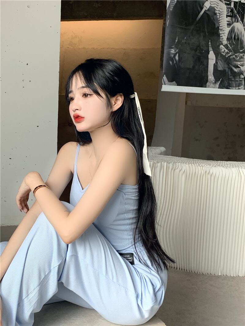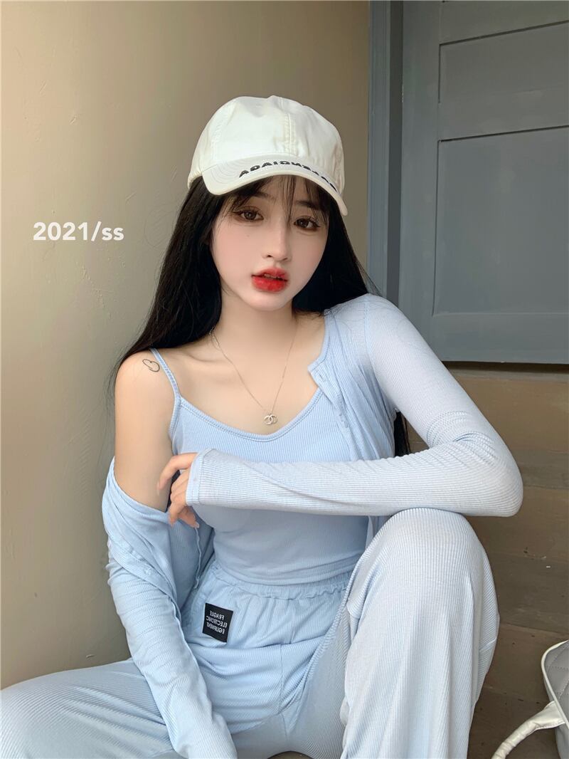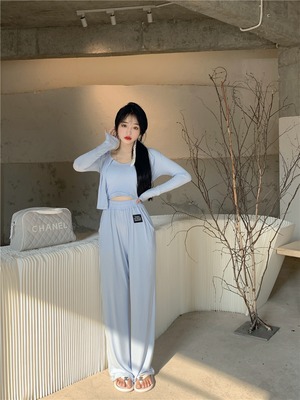 色:チェストパッド付きライトブルースリング,ライトブルーのワイドレッグパンツ,ライトブルーのカーディガン
