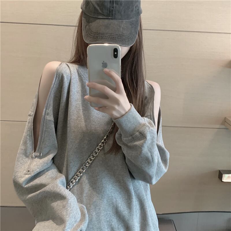 ルーズトップス スタイルストラップレスジッパーラウンドネックプルオーバー Tシャツ ロング Oネック Xiaofeijia58745276961