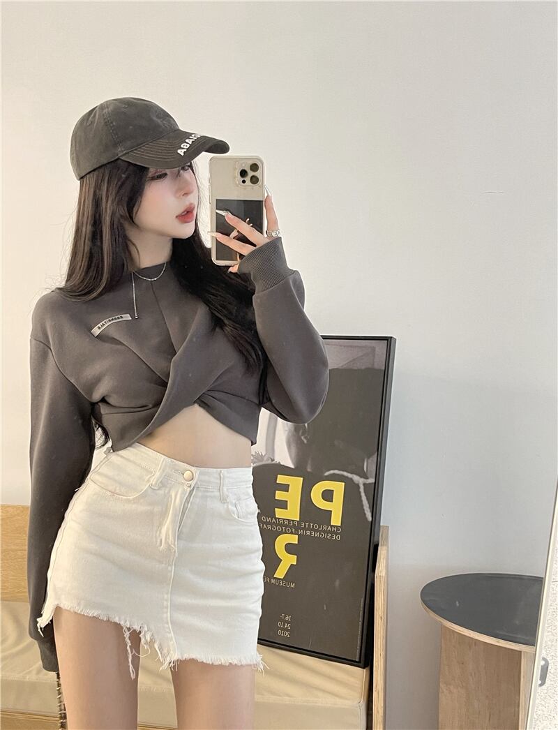 ラウンドネックショートセーター レディーススプリングオータムハイウェストクロップトップ トップス ロング 春物 秋物 Oネック Xiaofeijia16718438472