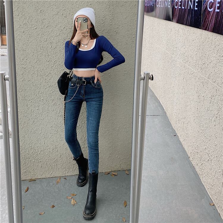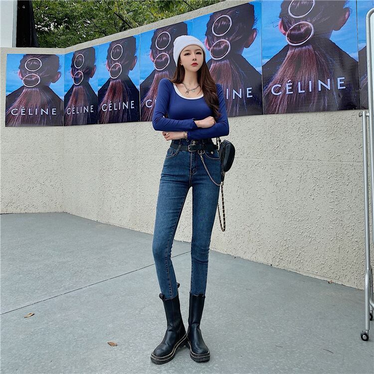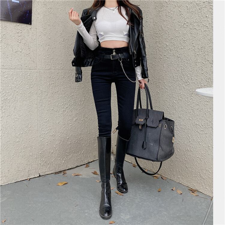 スキニーハイウェストウェストチェーン ベルト ジーンズ ブラックパンツ オータム 秋物 ハーネス Xiaofeijia46269368920