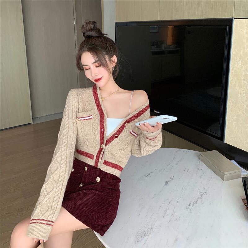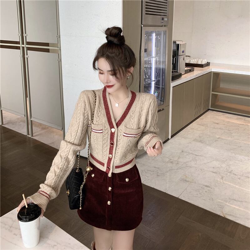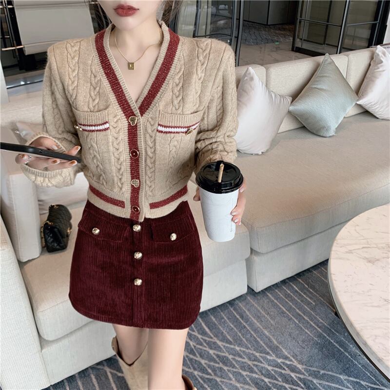 色:コーヒー色のカーディガン,ブルゴーニュスカート