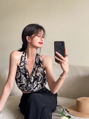 ホルターVネックフローラルショートトップス サマー レース 夏物 花柄 レースアップ Xiaofeijia62792890849