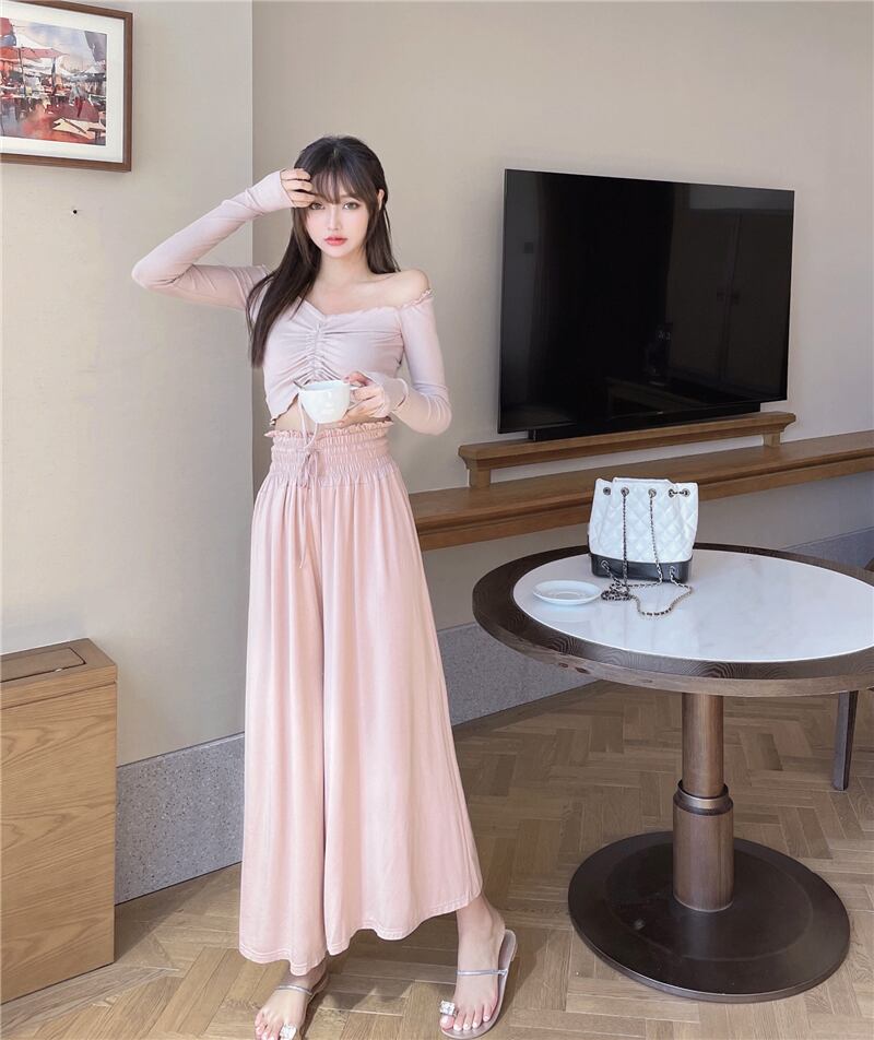 ストラップレスショートトップス ハイウェストパンツ ブラウス オータムギャザーTシャツ ロング 秋物 ピュア Xiaofeijia46296395907