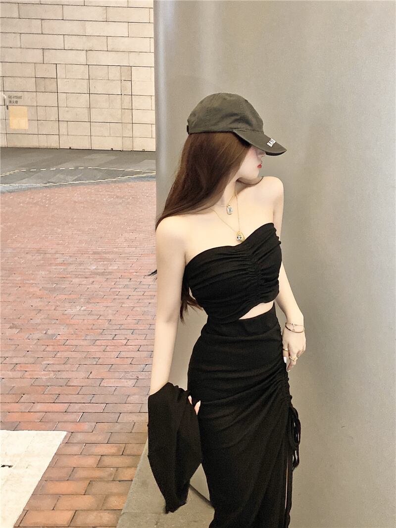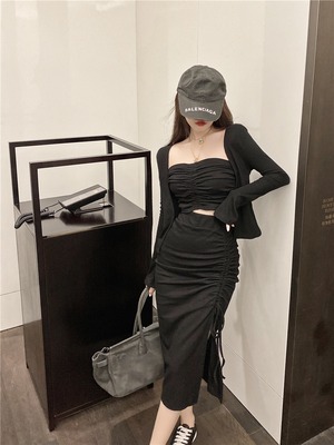 オータムカーディガンギャザースカート ブラック ロング 秋物 ピュア Xiaofeijia52007691335