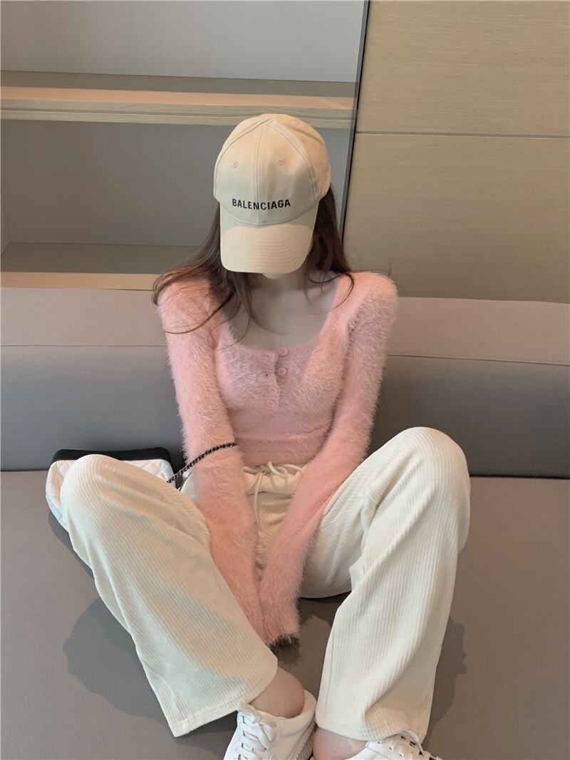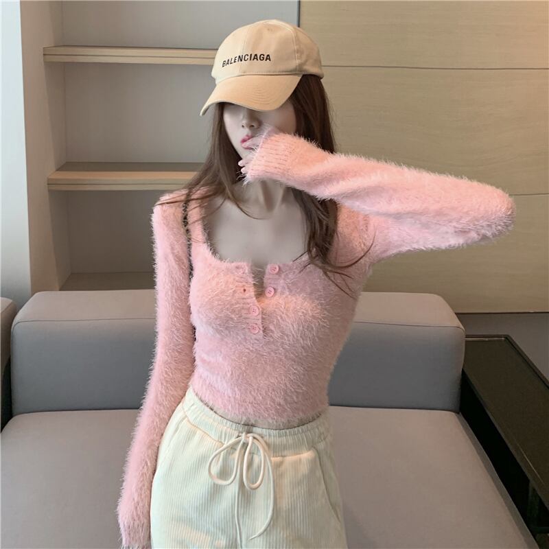 ニットセーター ボタンスリムショートプルオーバー オータム薄手トップス ロング ピンク 大人ガーリー スウィート キュート カジュアル 秋物 Xiaofeijia91797829977