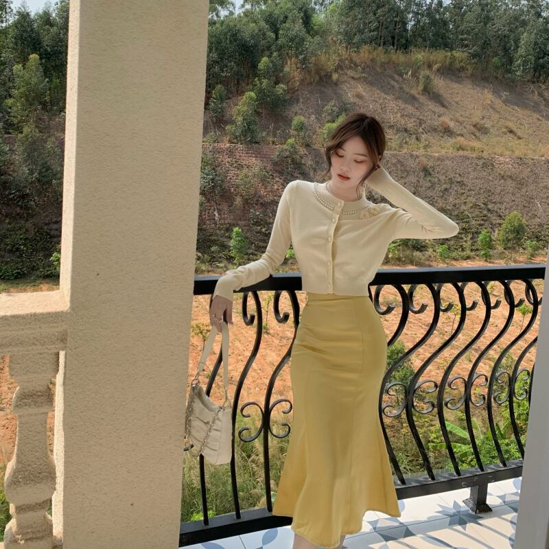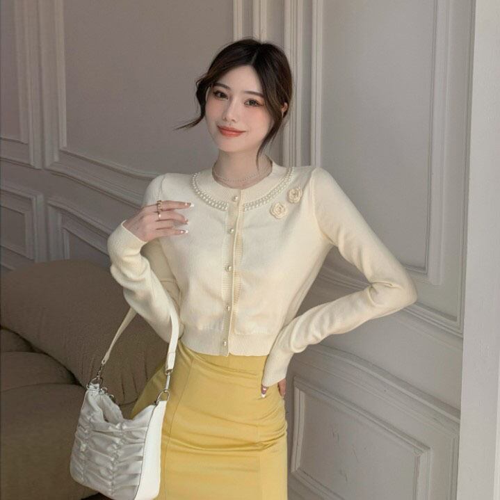 オータムスタイルショートパールボタンカーディガンセーター スリムラウンドネックトップス ロング 秋物 Oネック 真珠 Xiaofeijia63632195895