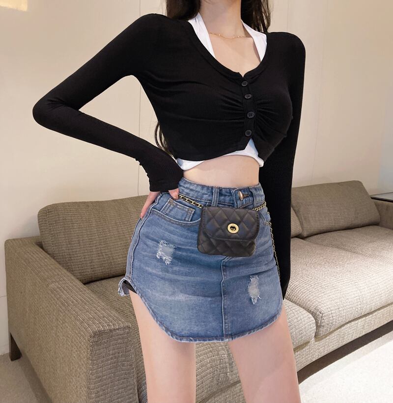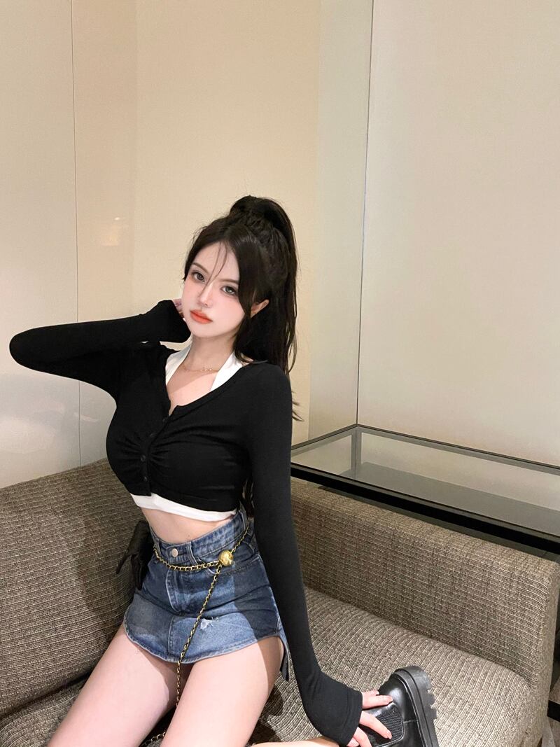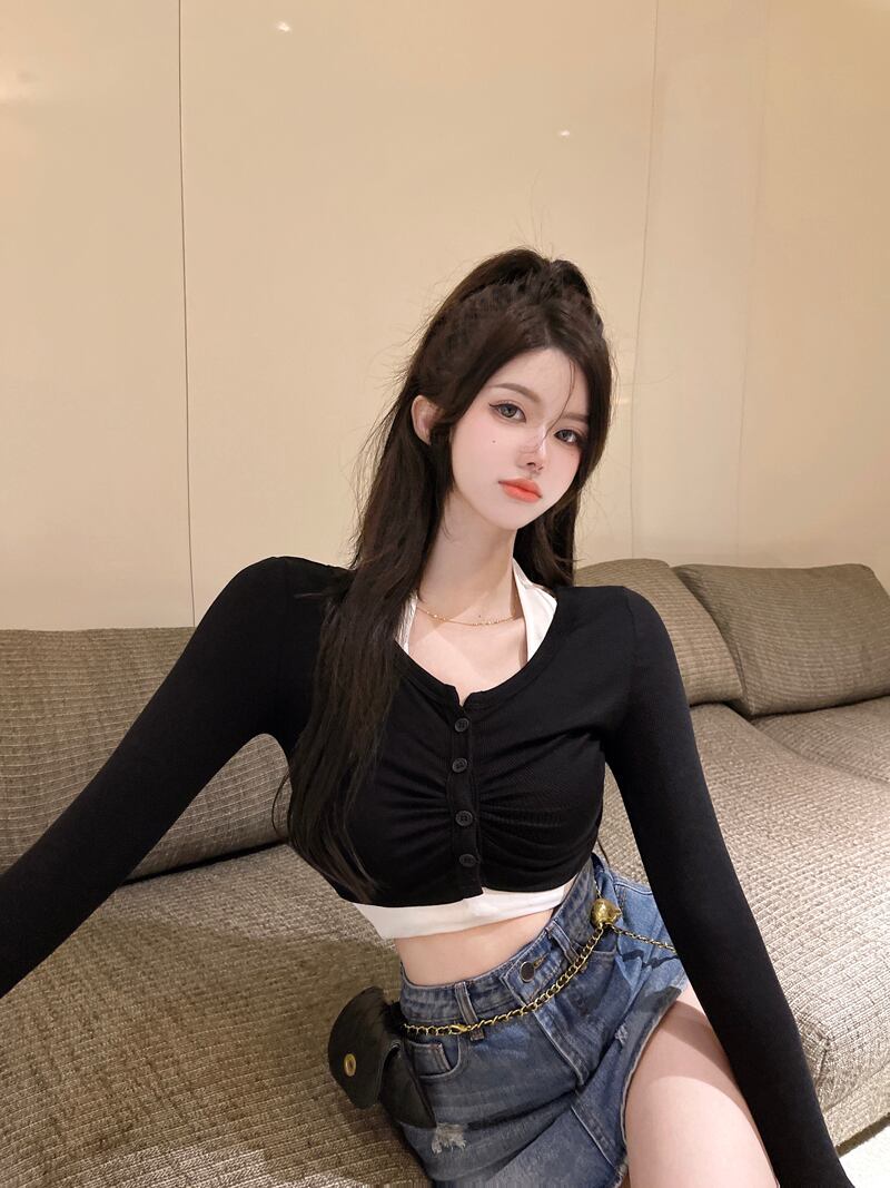 プリーツVネックホルターショートトップス ロング カーディガン オータム 秋物 Xiaofeijia61625778602