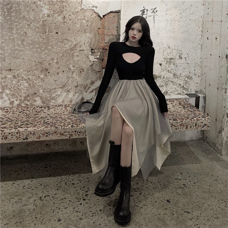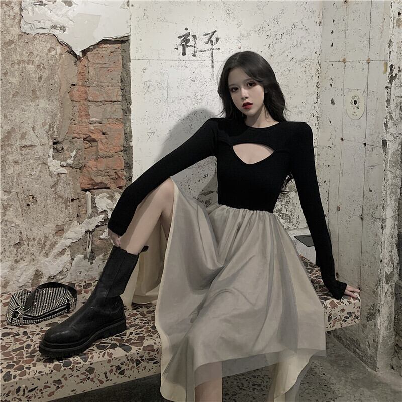 ブラックドレス オータムウェスト薄手メッシュスカート ロング 秋物 Xiaofeijia29354967572