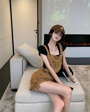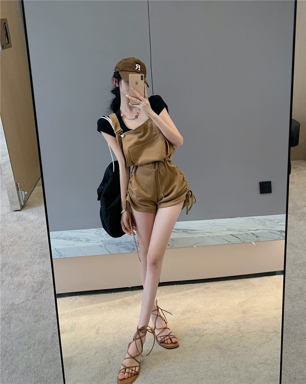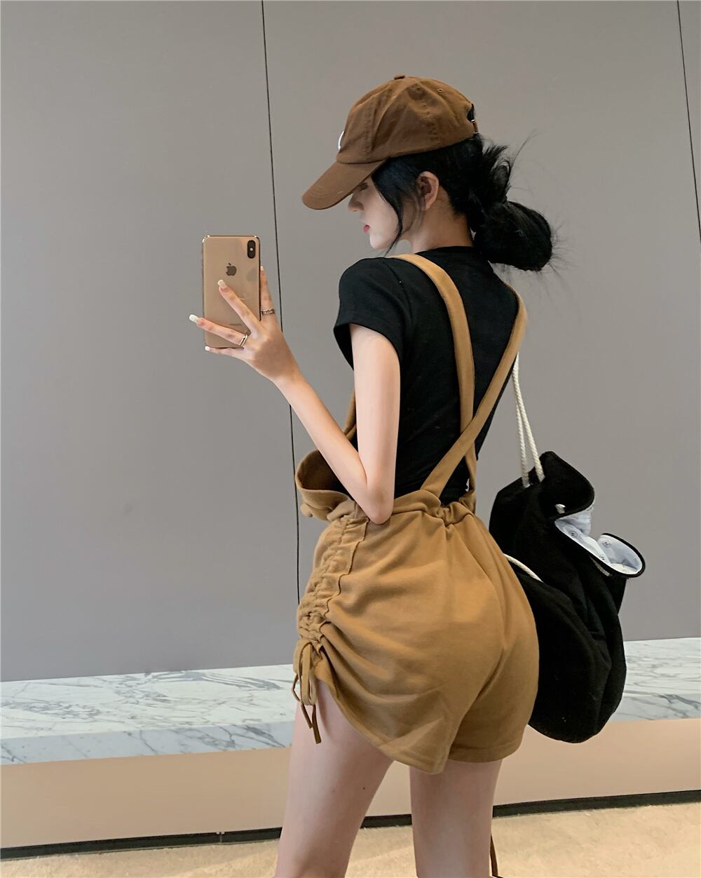スタンダードワンピースギャザーバッククロスオーバーオール レディースサマールーズハイウェストウェストパンツ スタイルカジュアルショーツ レトロ 夏物 ブルマー Xiaofeijia55765862009
