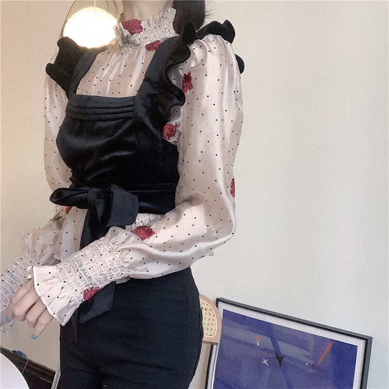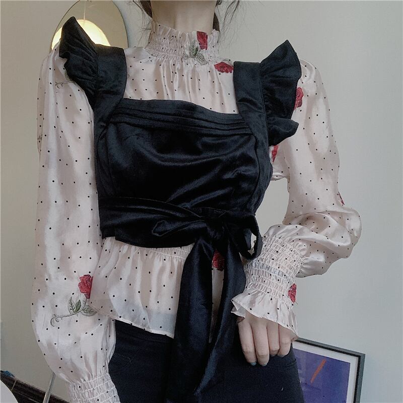 オータムシャツ ブラックベルベット レッド 刺繍 大人ガーリー スウィート キュート カジュアル 秋物 Xiaofeijia74116799241