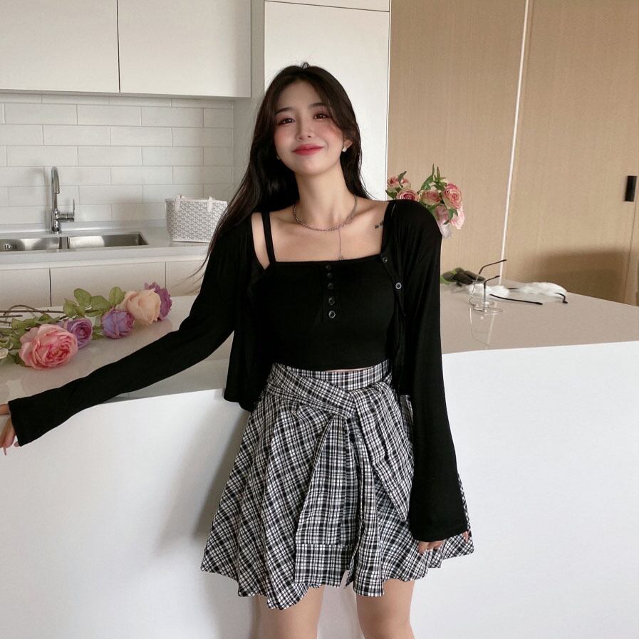 ブラックカーディガンセット ウェスト格子柄オータム ストリート 秋物 Xiaofeijia14404183268
