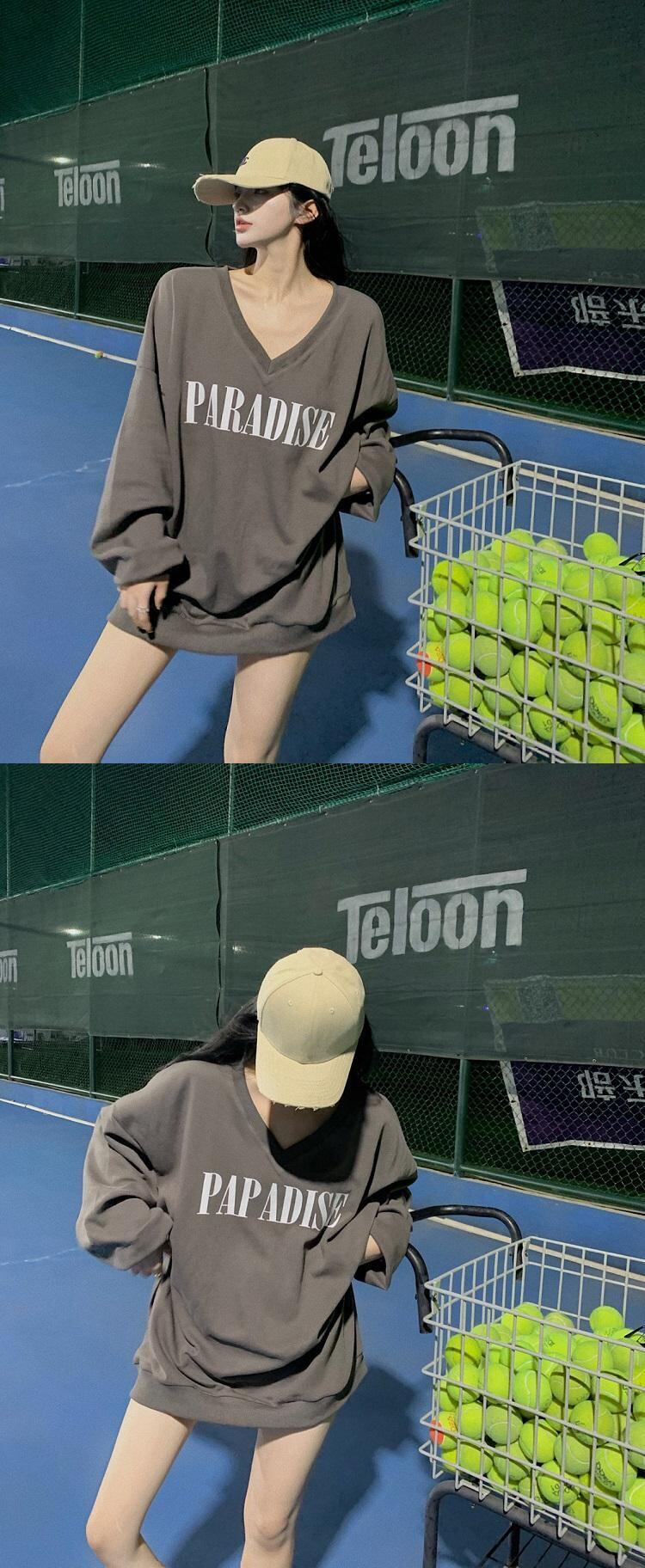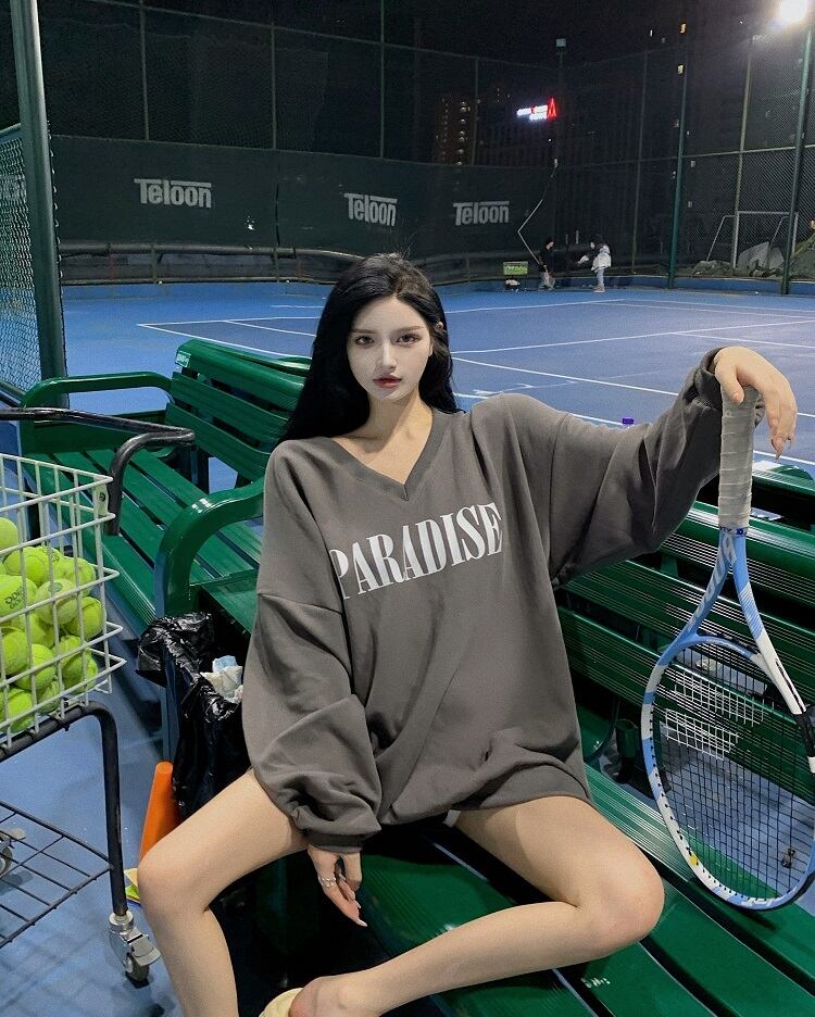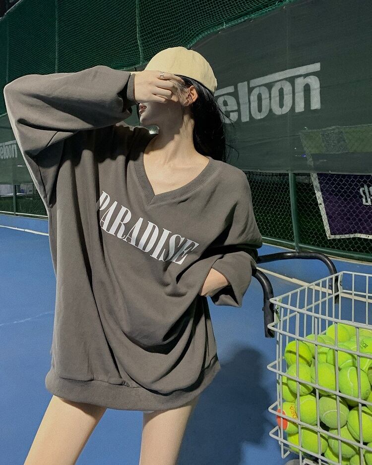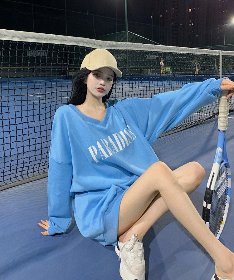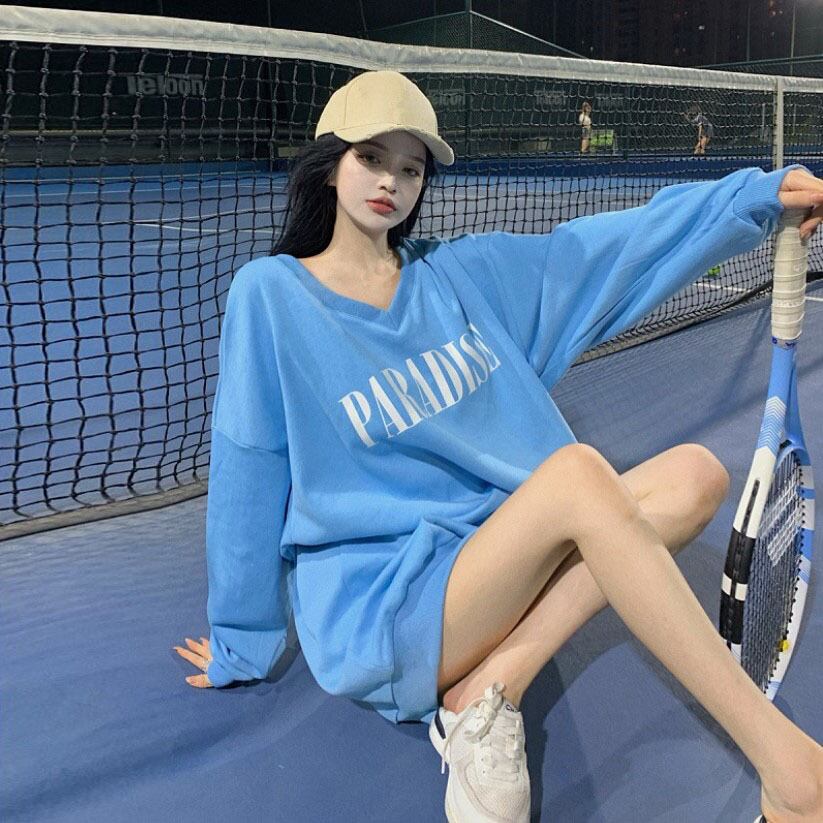 ブルーVネックセーター スプリングオータムラウンドネックルーズカジュアルスタイルプルオーバー トップス ロング 春物 秋物 Oネック Xiaofeijia47781379428