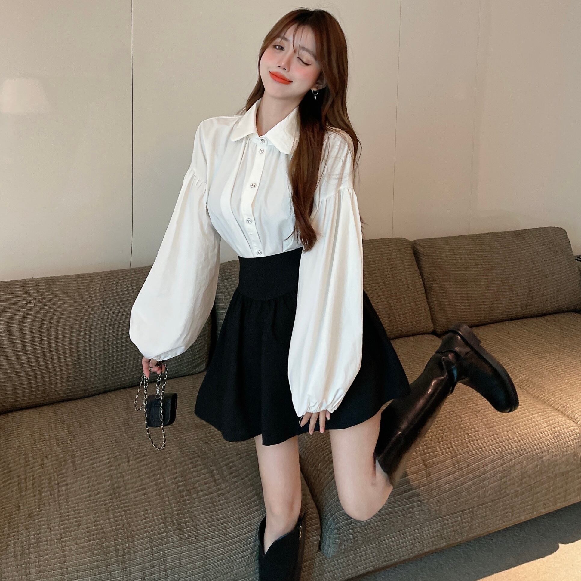 カラースタンダードシャツ スリーブスタイルオータムルーズトップス ロング レトロ レース 大人ガーリー スウィート キュート カジュアル 秋物 Xiaofeijia99029629413