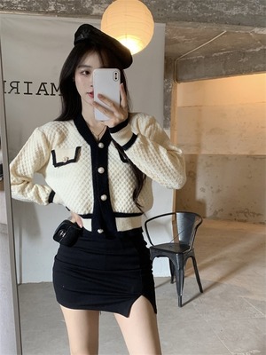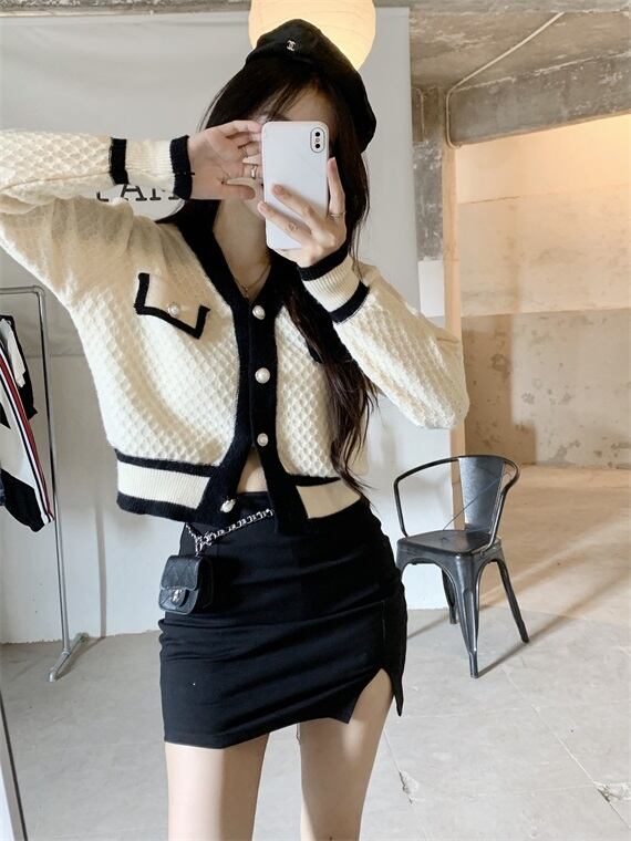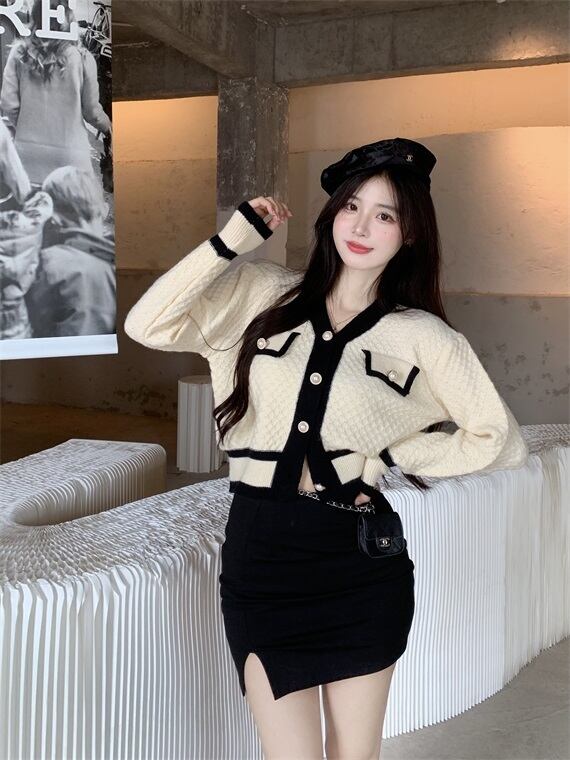 オータムスタンダードカラーVネックニットカーディガンパールバックルショートセーター ジャケット トップス ロング レトロ 秋物 真珠 Xiaofeijia98025011578