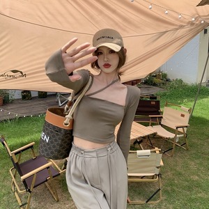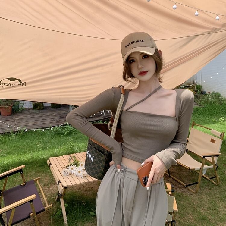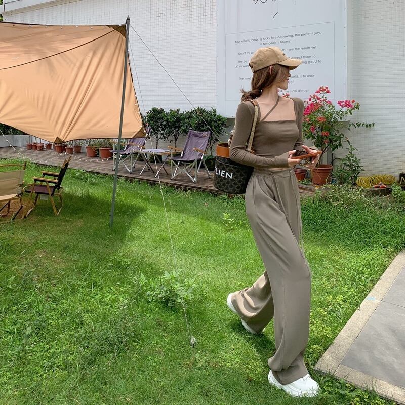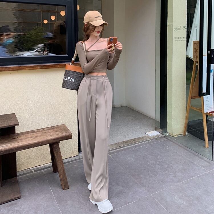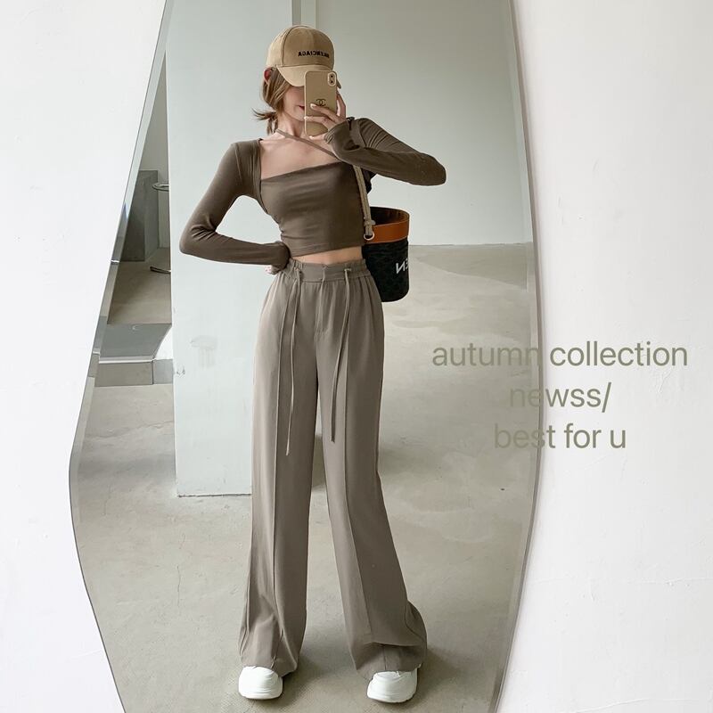 カラーTシャツ シャツ オータムショートトップス ハイウェストウェストパンツ ロング 秋物 スクウェア Xiaofeijia10604721319