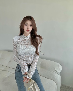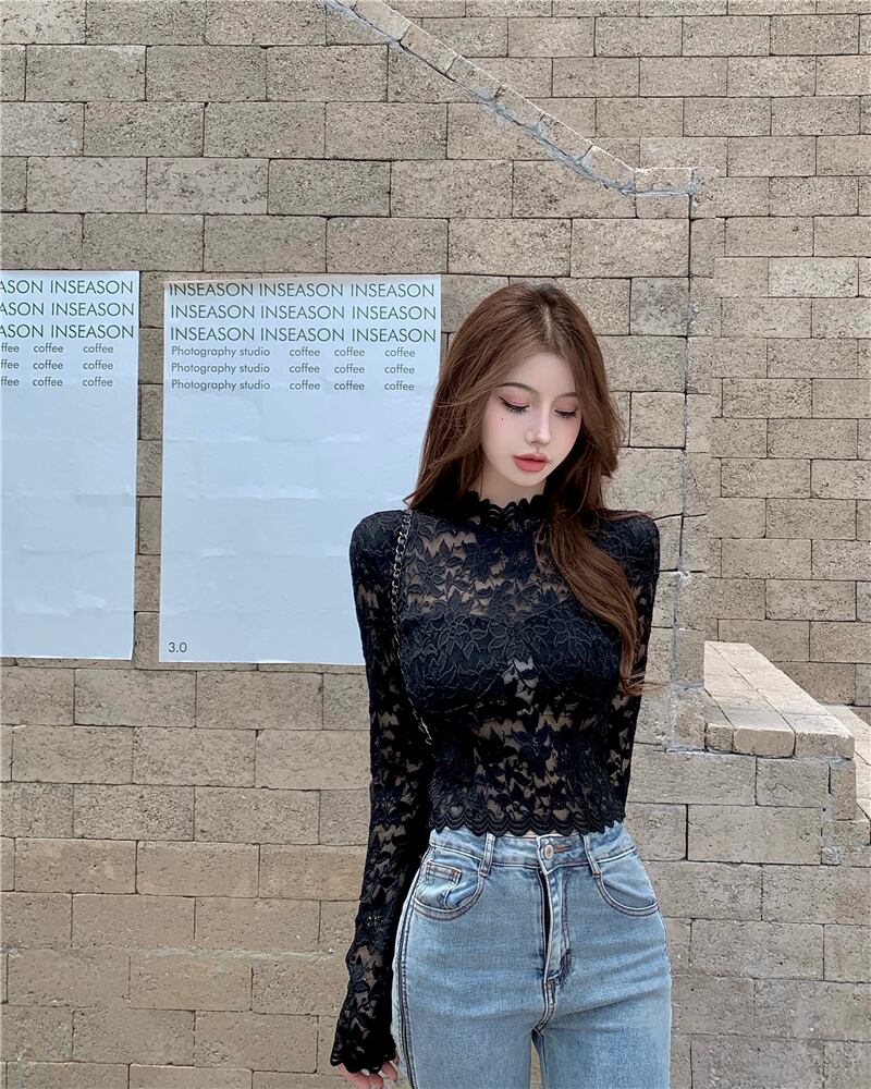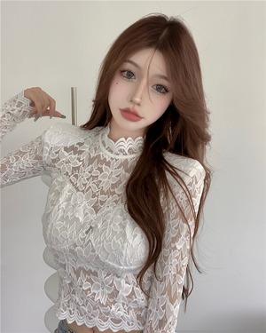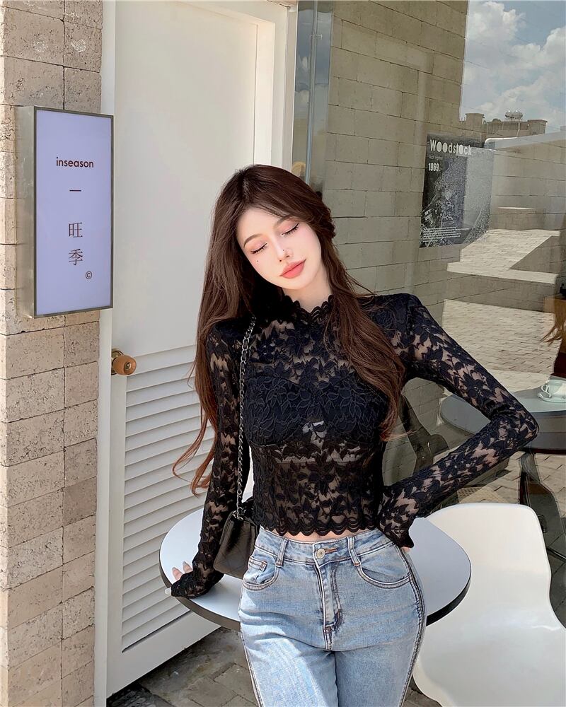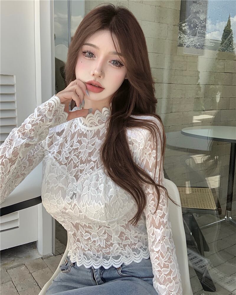 オータムレースシャツ ブラウス スリムクロップトップ トップス ロング 秋物 Xiaofeijia65385459586