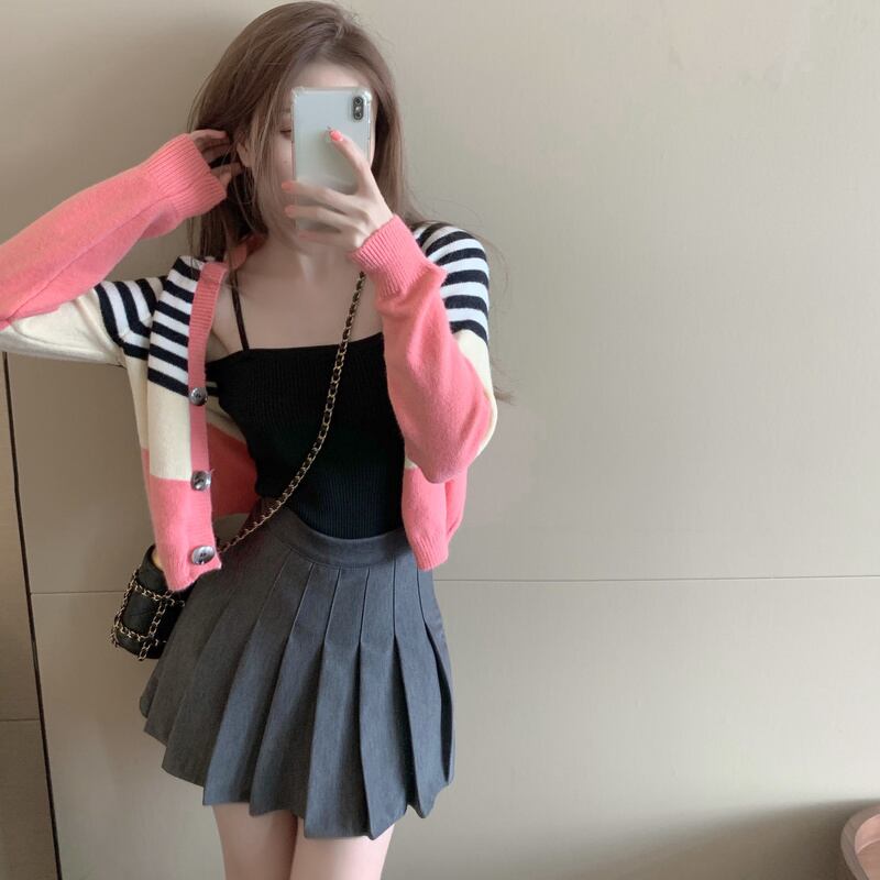 ストライプセーター カーディガンジャケット ハイウェストウェストプリーツスカート レディース ピンク Xiaofeijia84453929424