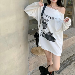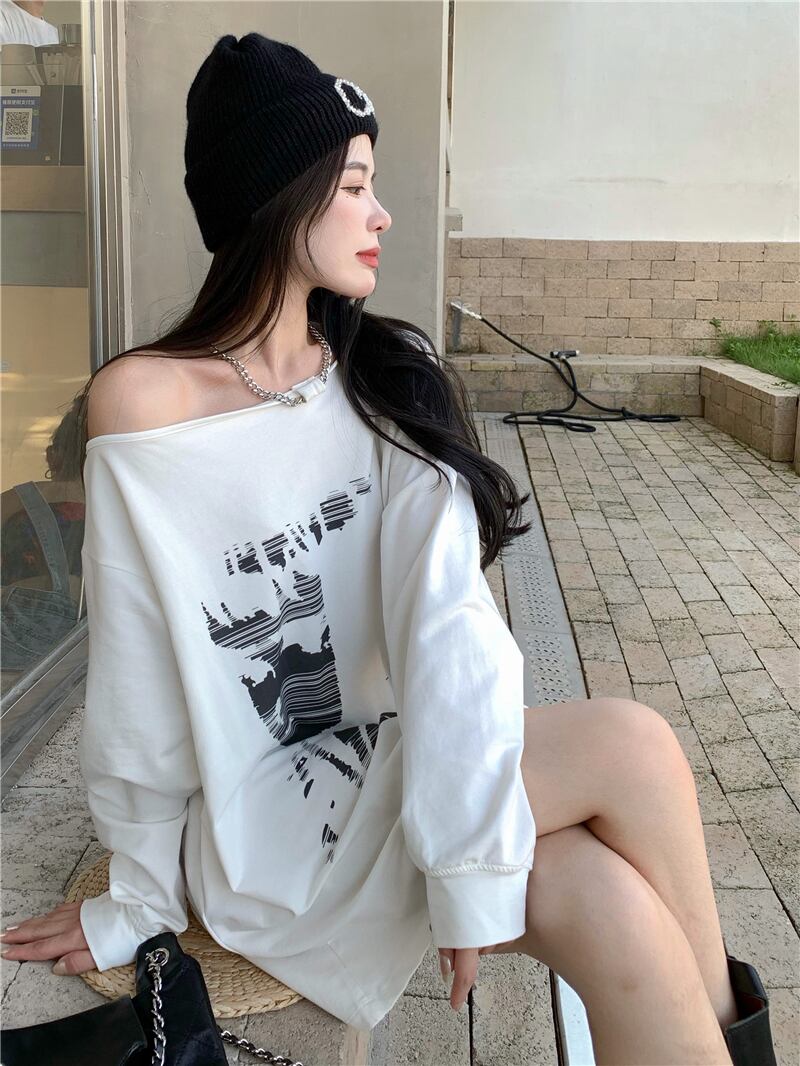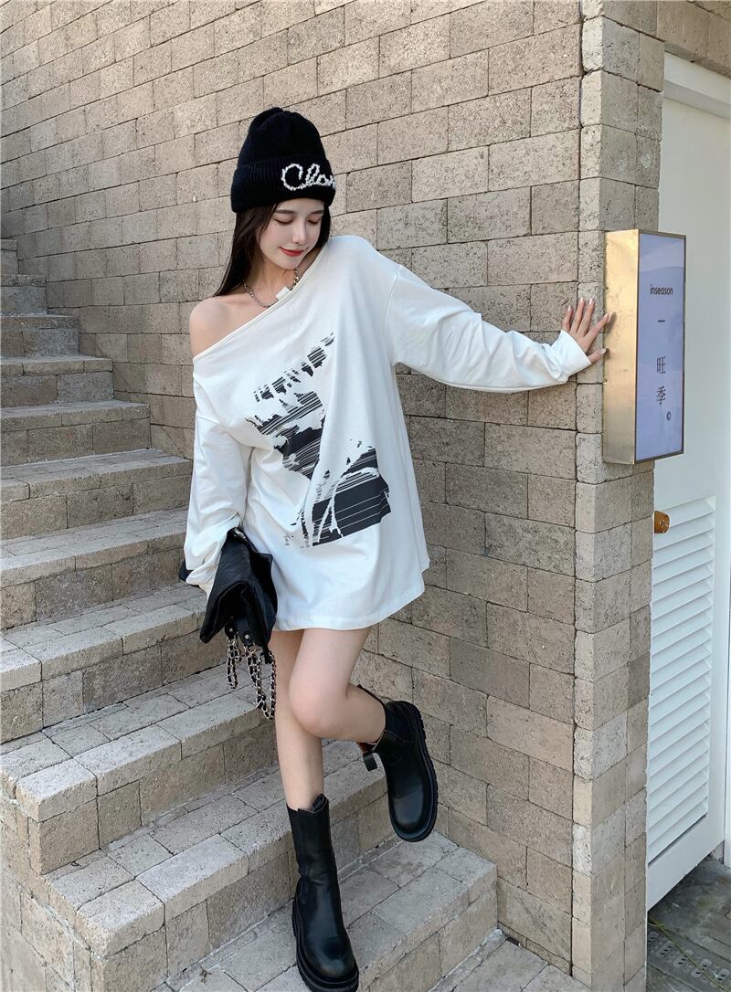 チェーン ホワイトプリントTシャツ オータムカラールーズラウンドネックトップス ロング 秋物 Oネック オフショルダー Xiaofeijia16019521995