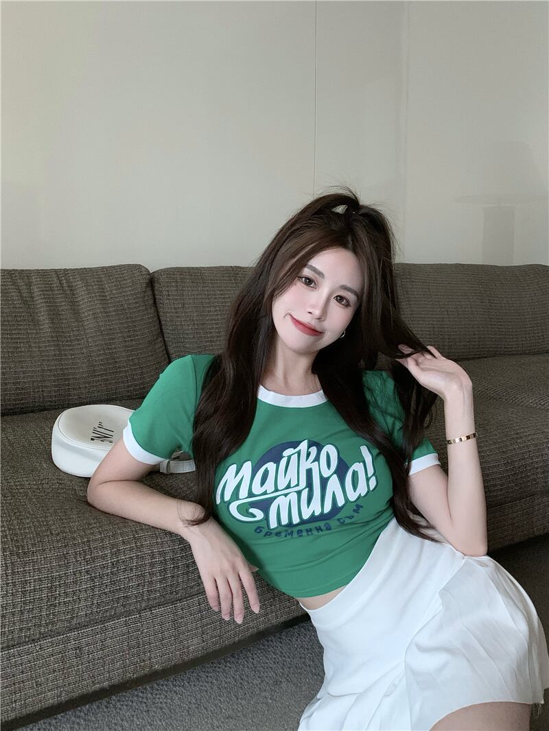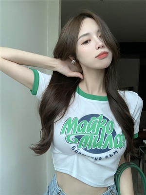 サマーカラーサイドプリントショートTシャツ スリムラウンドネックハイウェストウェストトップス 夏物 Oネック Xiaofeijia72792433578