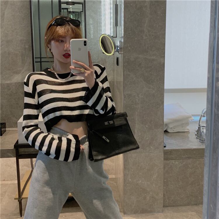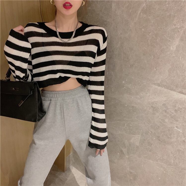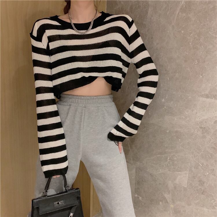 ルーズストライプショートニットセーター レディース薄手ブラウス ロング サマー 夏物 シルク Xiaofeijia21849456942