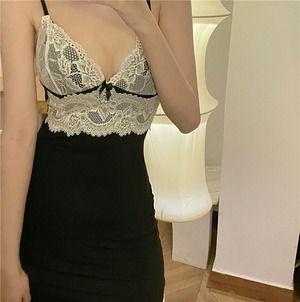レースリボンVネックFlowerデザイン スカート サマーブラックドレス 夏物 フラワーデザイン ステッチ Xiaofeijia31460964071