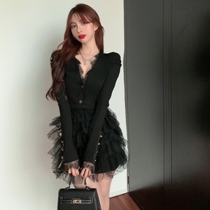 スプリングオータムVネックレースドレス ウェストスカート 春物 秋物 Xiaofeijia99004963815