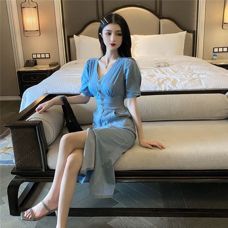 スタンダードドレス ウェストVネックスカート サマー レトロ 夏物 Xiaofeijia35094509653