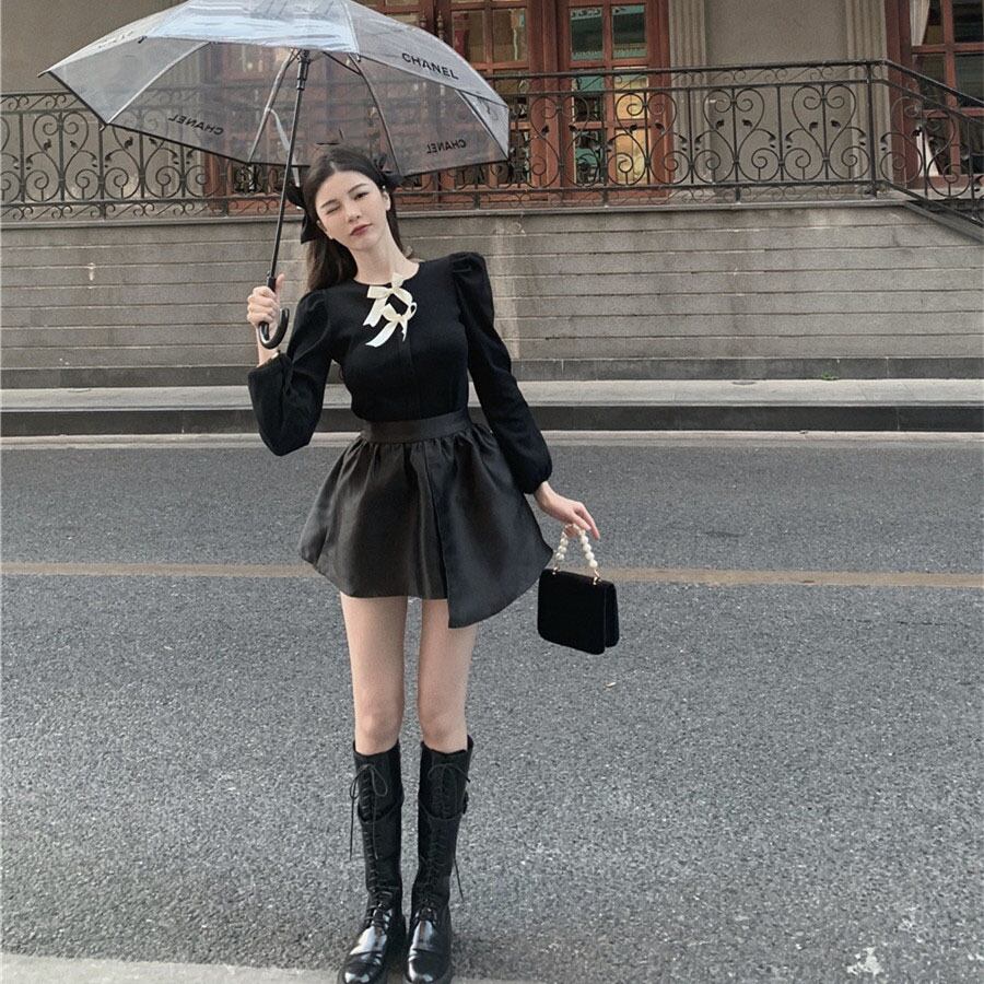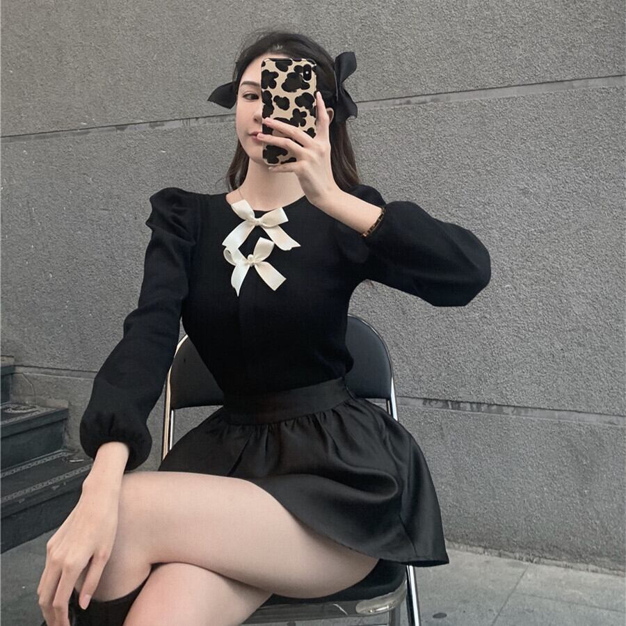 スプリングスリーブトップス ブラックショートスカート レディース リボン ふわふわ 春物 Xiaofeijia4797703352
