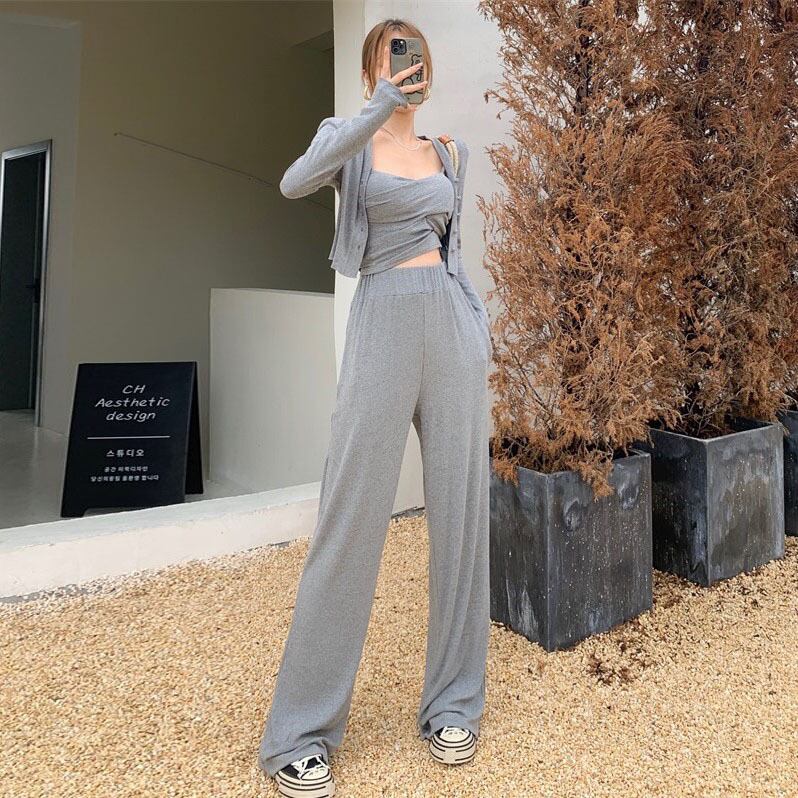 色:グレーストラップ+カーディガン,グレーのワイドレッグパンツ,ブラックストラップ+カーディガン,黒のワイドレッグパンツ