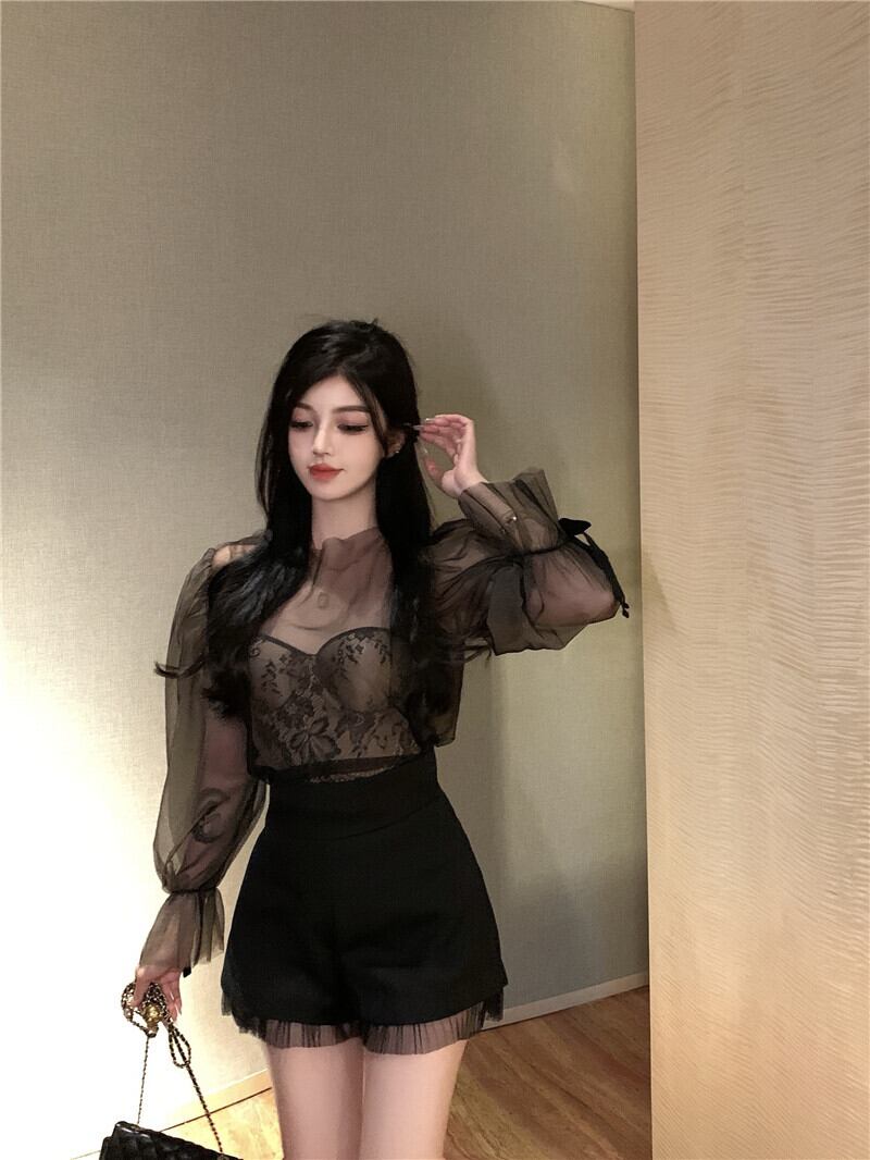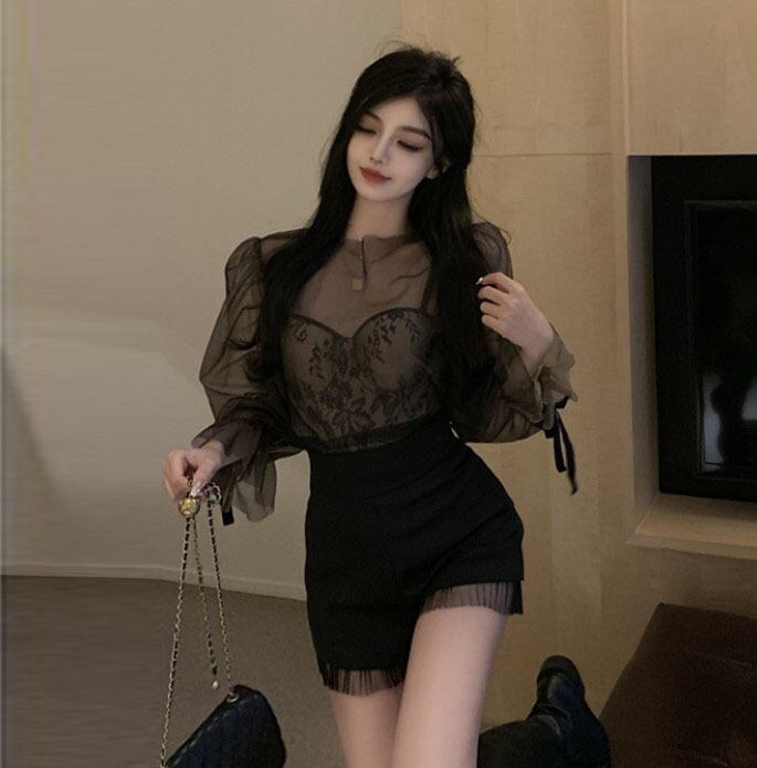 オータムレッドスタンダードシャツ レースメッシュブラックショーツ レトロ 秋物 ブルマー Xiaofeijia46519516596