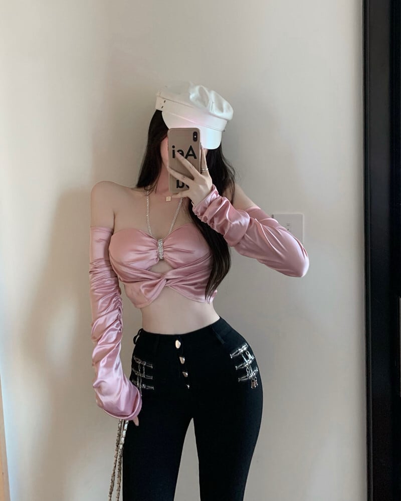 ショートプリーツトップス レディース ロング ピンク ピュア Xiaofeijia10809865425