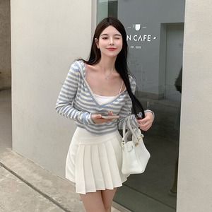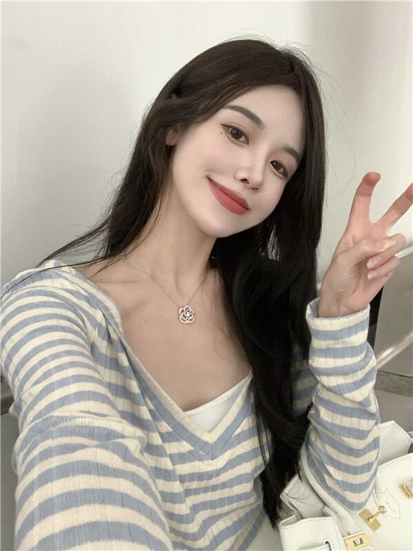 スタイルストライプフードセーター オータム薄手Vネックカジュアルトップス ショート ロング かわいい 秋物 Xiaofeijia5158969381